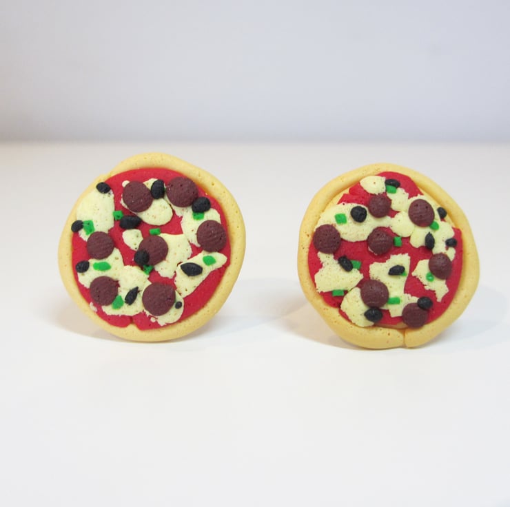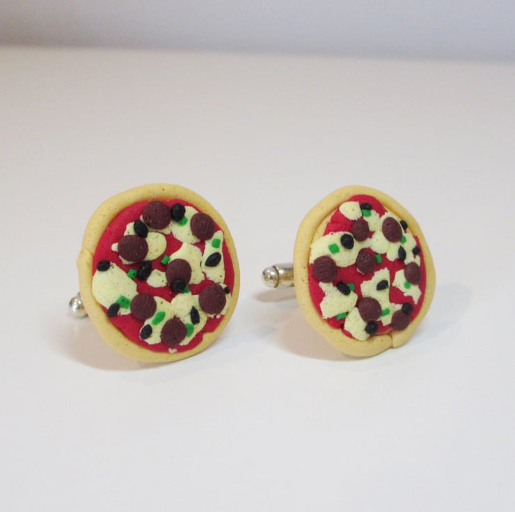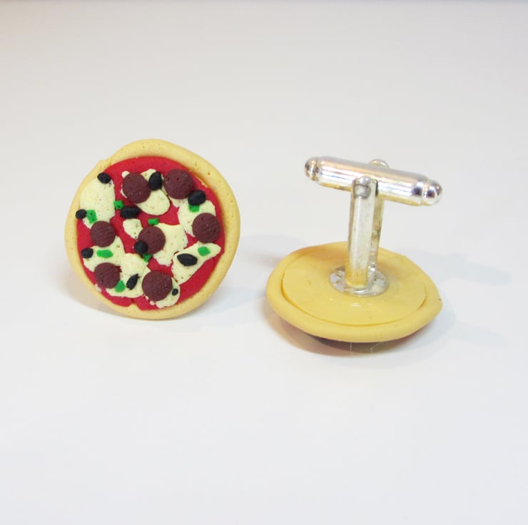 Two large pizza charms fixed to cufflinks! Give your suit an extra touch with these themed cufflinks! Carefully handcrafted for authenticity - something different for your suit! Toppings have carefully been added for extra flavour, including green peppers, olives and pepperoni!