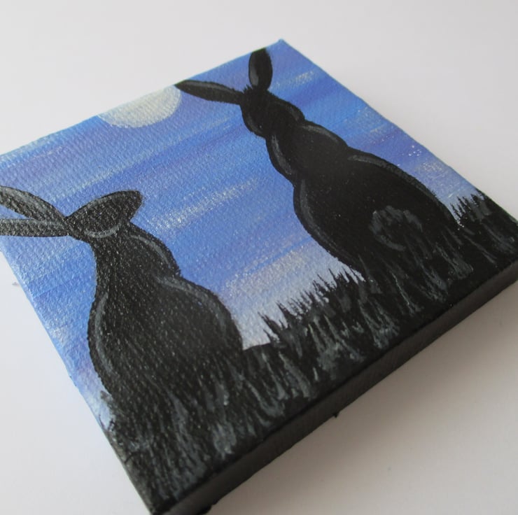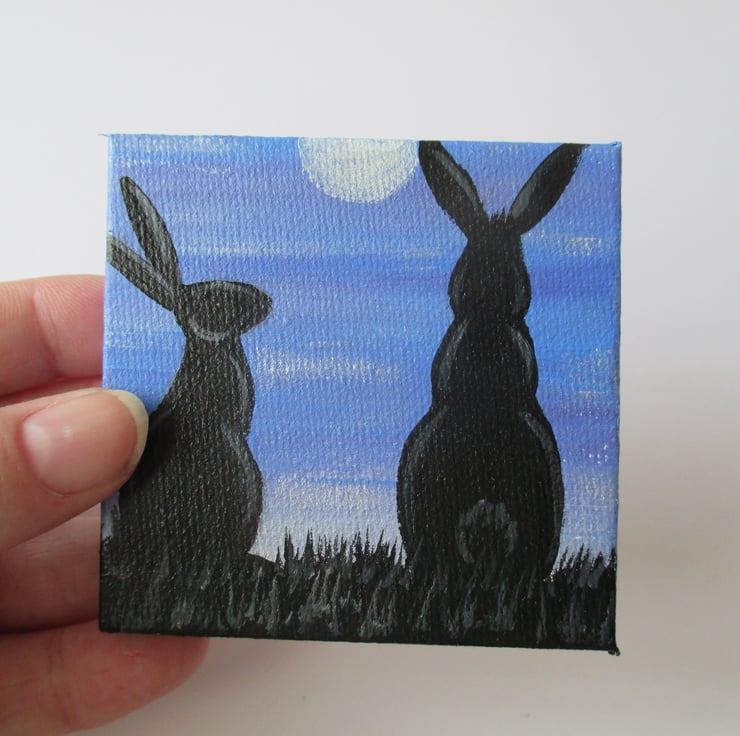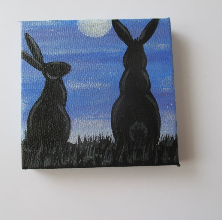 This is a mini canvas, painted with two bunnies silhouetted against a sky in shades if blue with hints of purple. The bunny rabbits are black with highlights on certain areas.