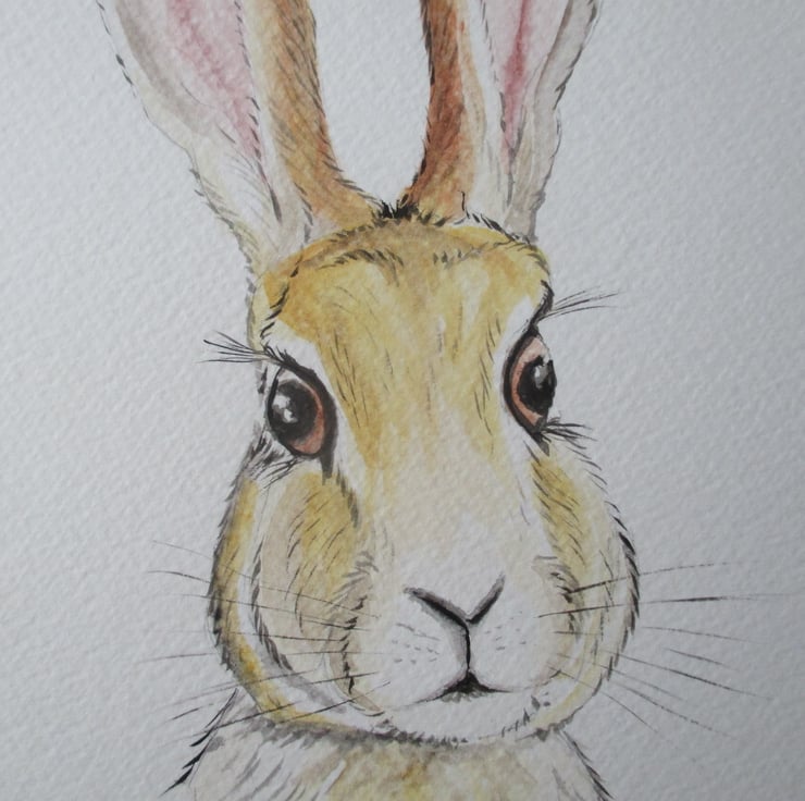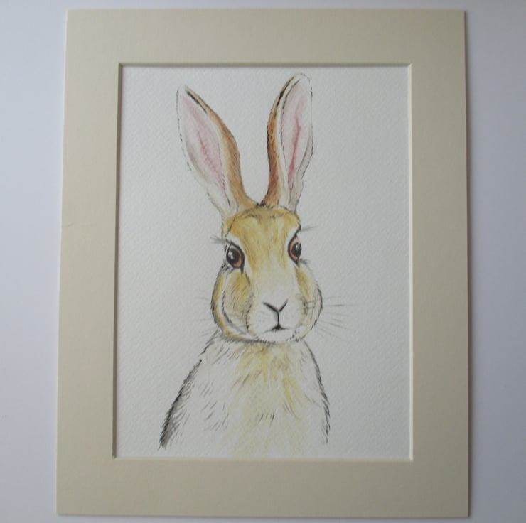 An original watercolour painting of a hare, painted in watercolour paper. This is mounted ready to fit into an 8 x 10 inch frame. Signed and dated on the reverse.