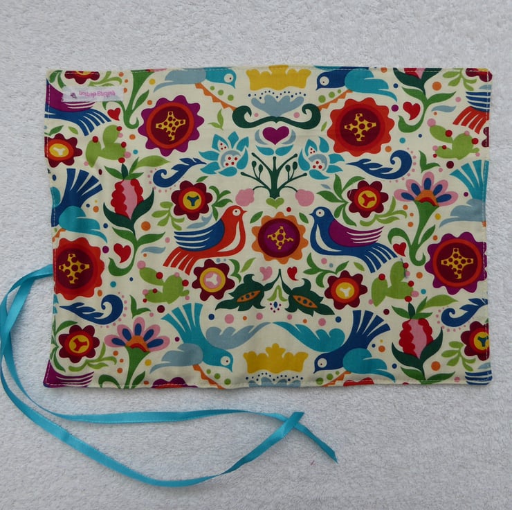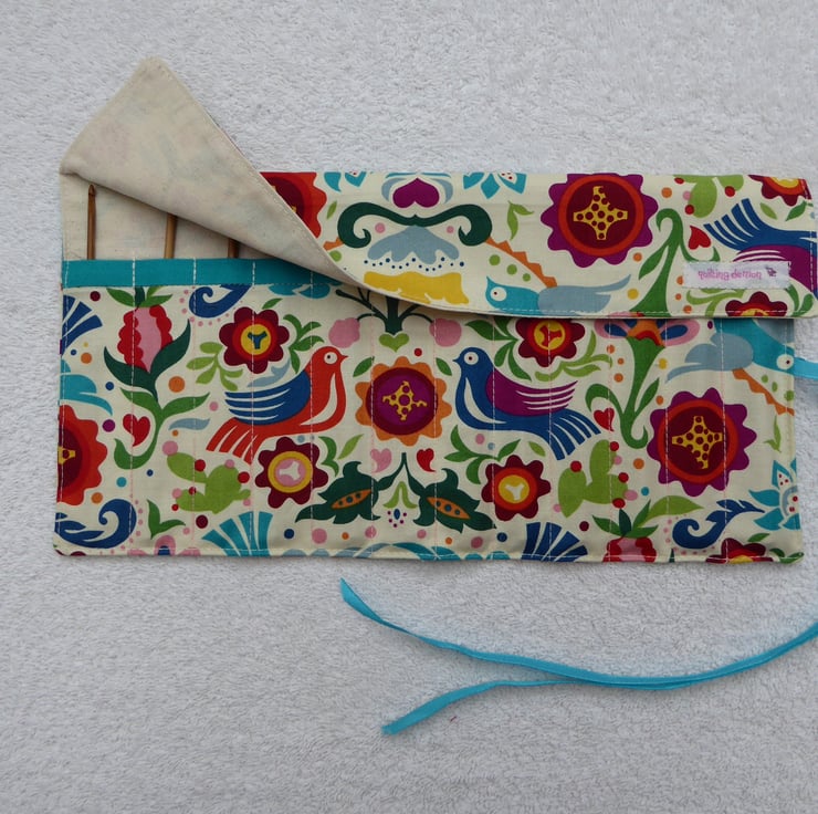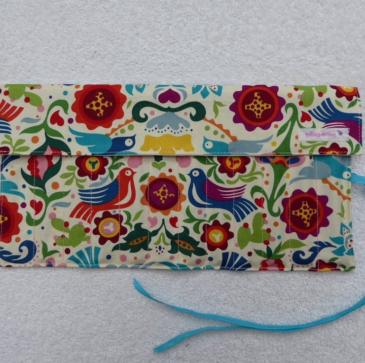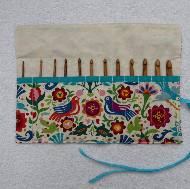 I have used a 100% cotton fabric to create this fantastic crochet hook case. It is sewn from a lovely folk art print fabric with a plain cream lining and has a turquoise ribbon tie.