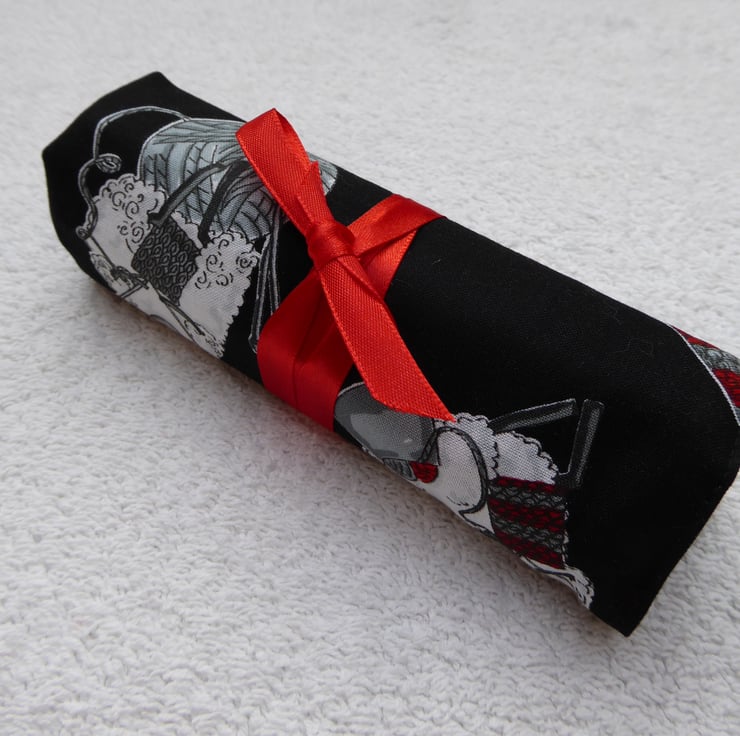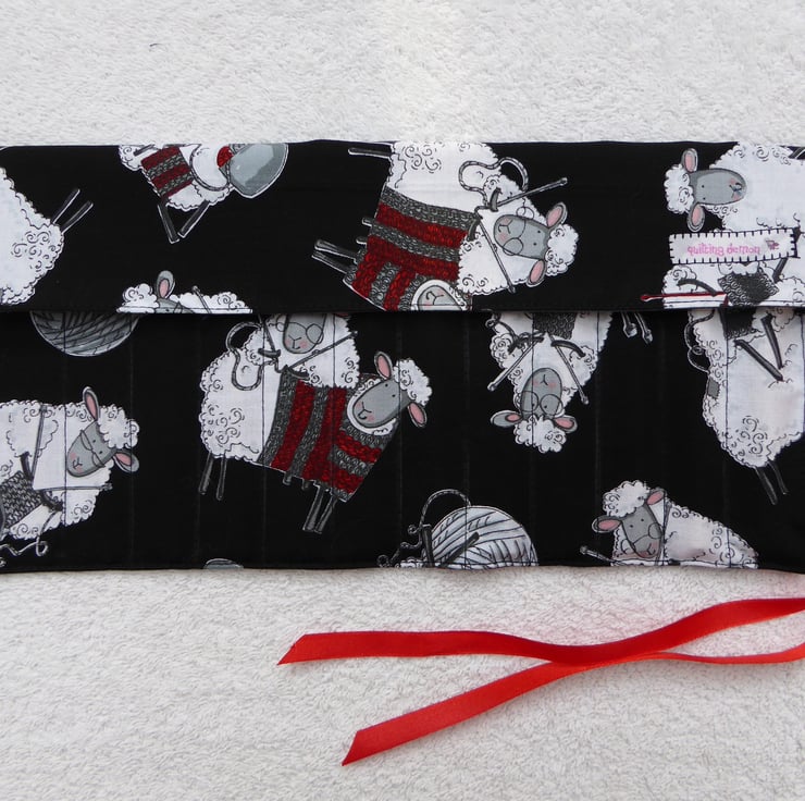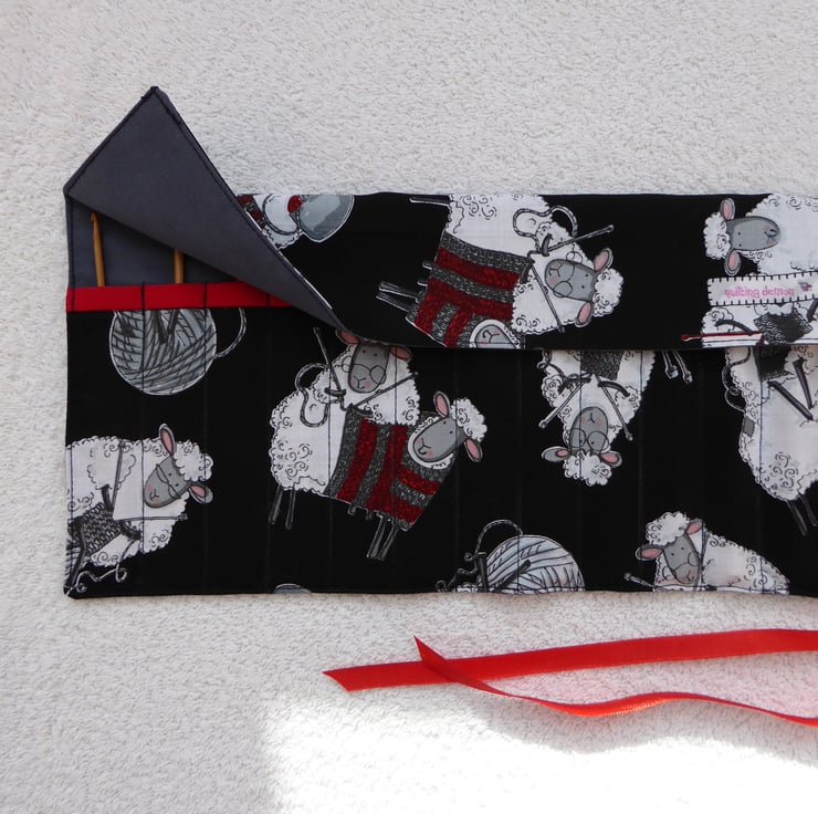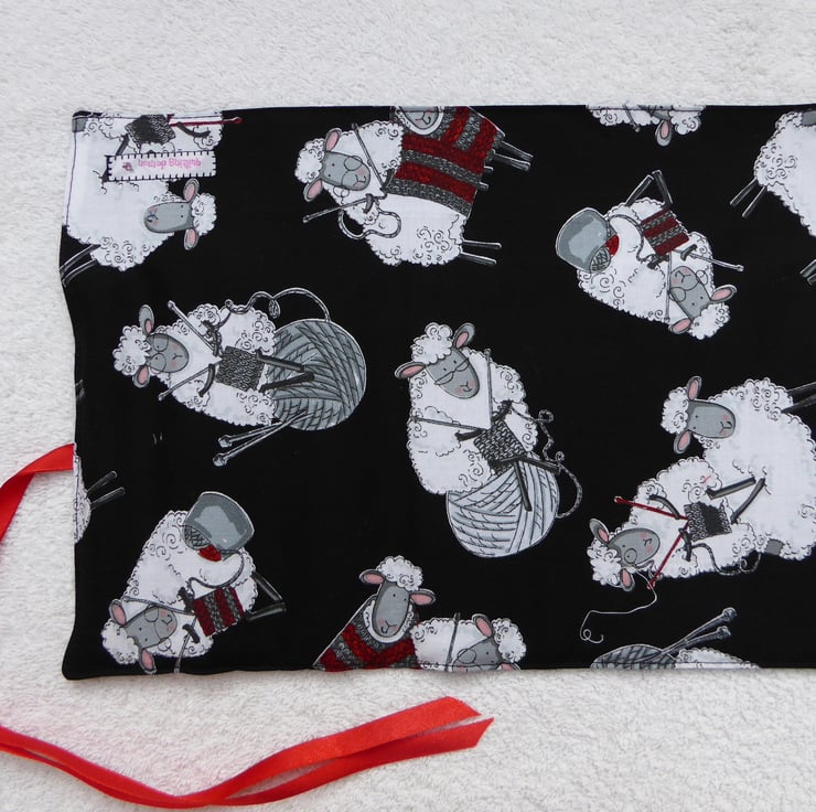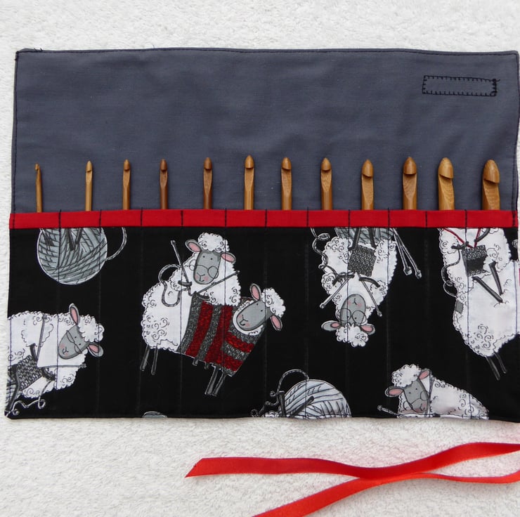 I have used a 100% cotton fabric to create this fantastic crochet hook case. It is sewn from a lovely knitting sheep print fabric with a plain grey lining and has a red ribbon tie.