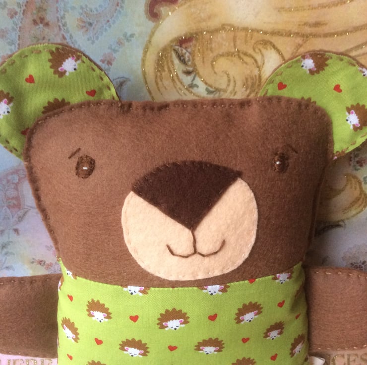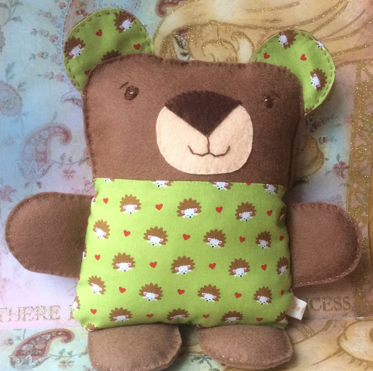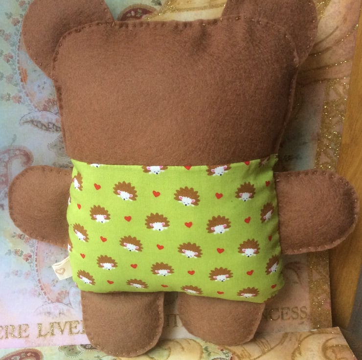 Made using 100% brown Felt, and a cute hedgehog fabric, features are