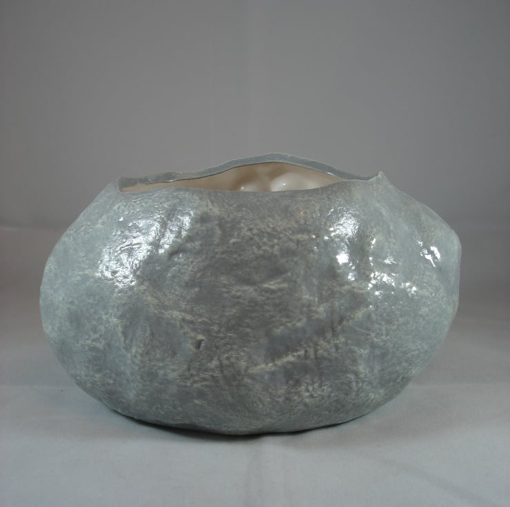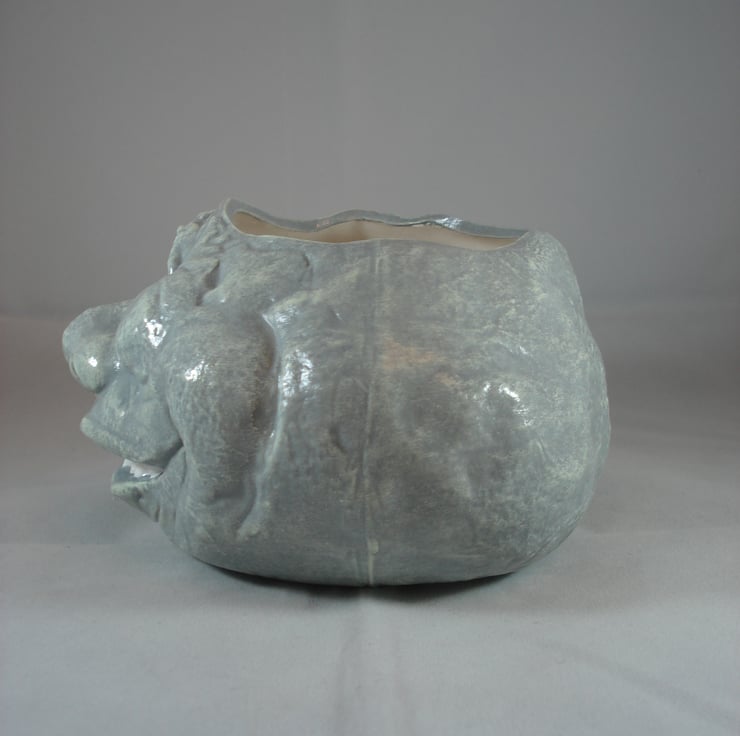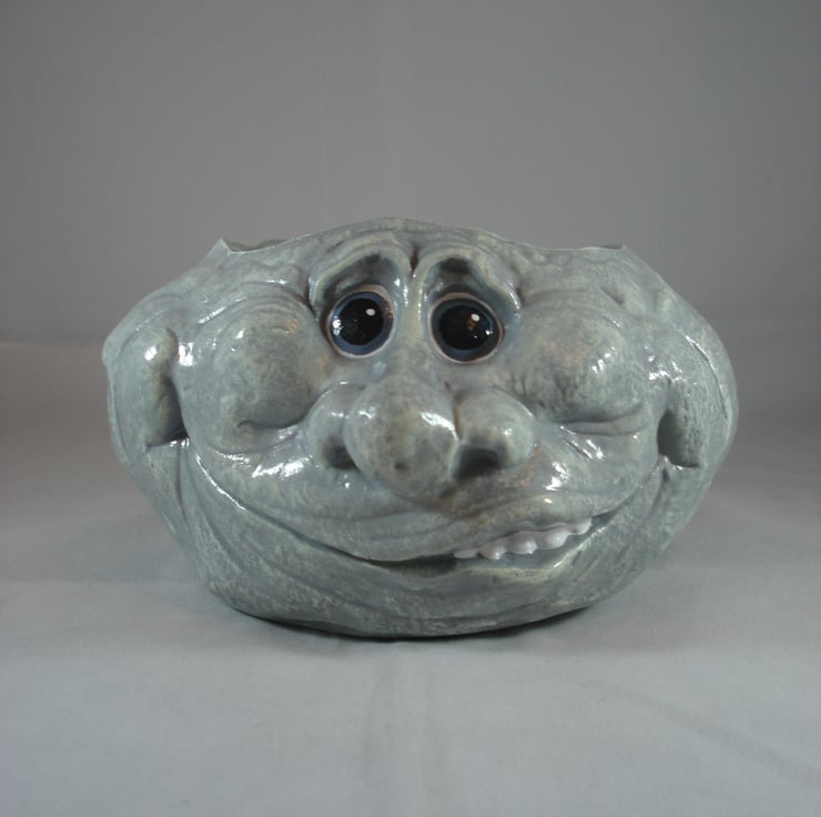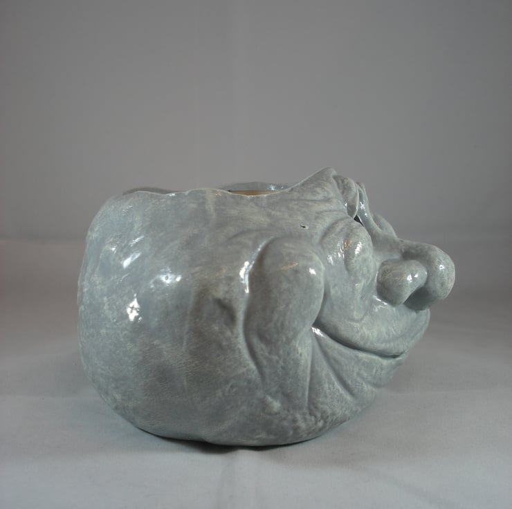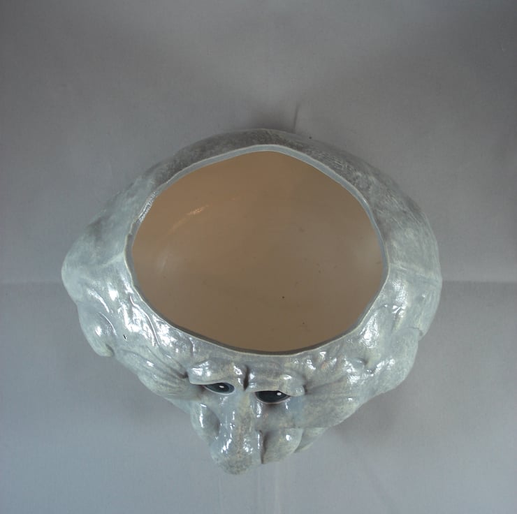 I have for sale a small novelty ceramic plant pot, which was hand painted by myself. It is in the shape of a piece of rock or stone with a face on the front. The pot has no drainage holes in the bottom of it, so it could be used indoors or out, also due to its size it could be used as a candle holder. This would make a fun and novel addition to anyone's home or garden, or perhaps given as a gift.