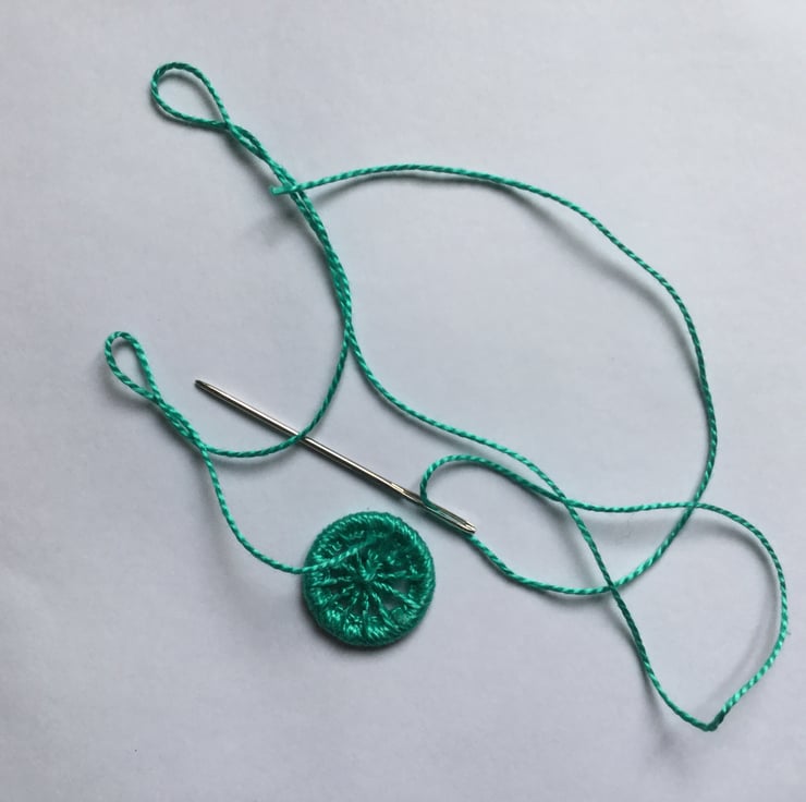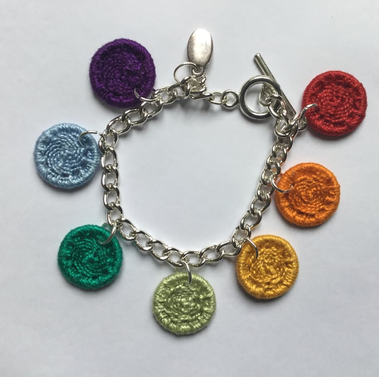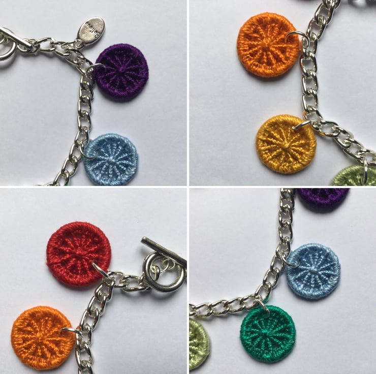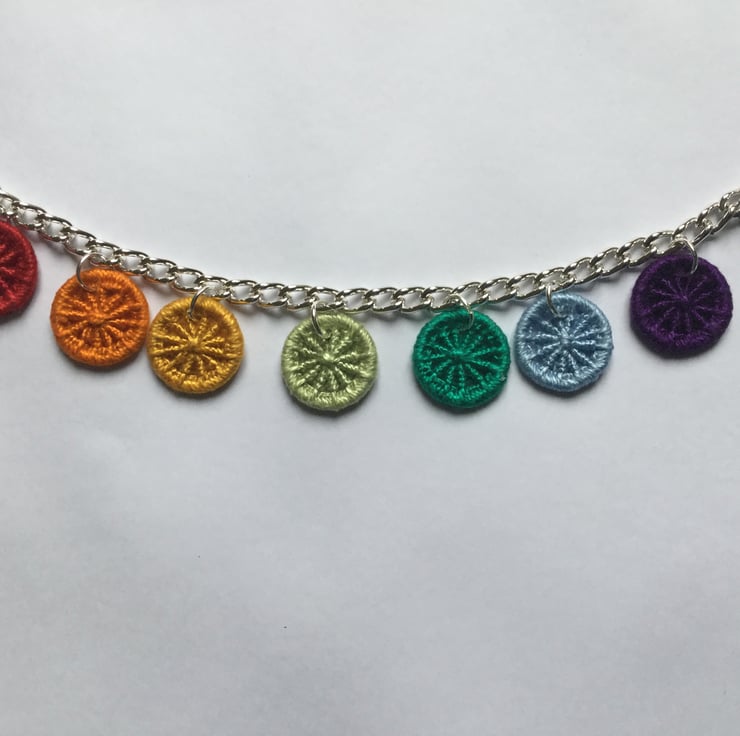 I have made these seven Dorset buttons using a Perle cotton thread on a 19mm brass ring. Each one is a different colour from the rainbow. There is also a tiny charm which reads 'Believe'
