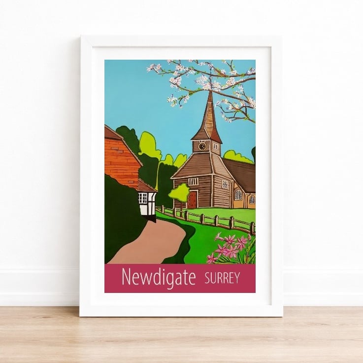A contemporary travel poster style print of the Surrey village of Newdigate, from my own original acrylic painting. A perfect gift for those who love Newdigate!
