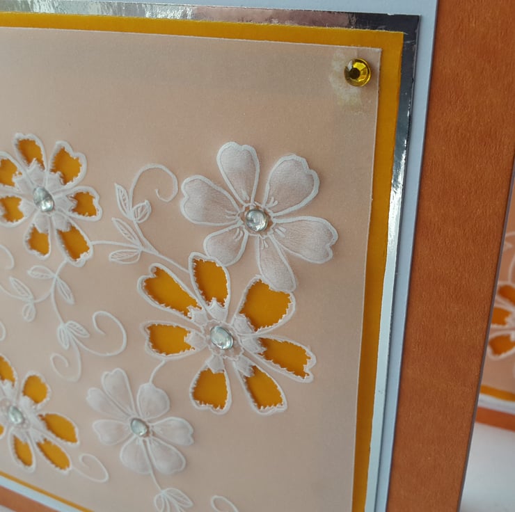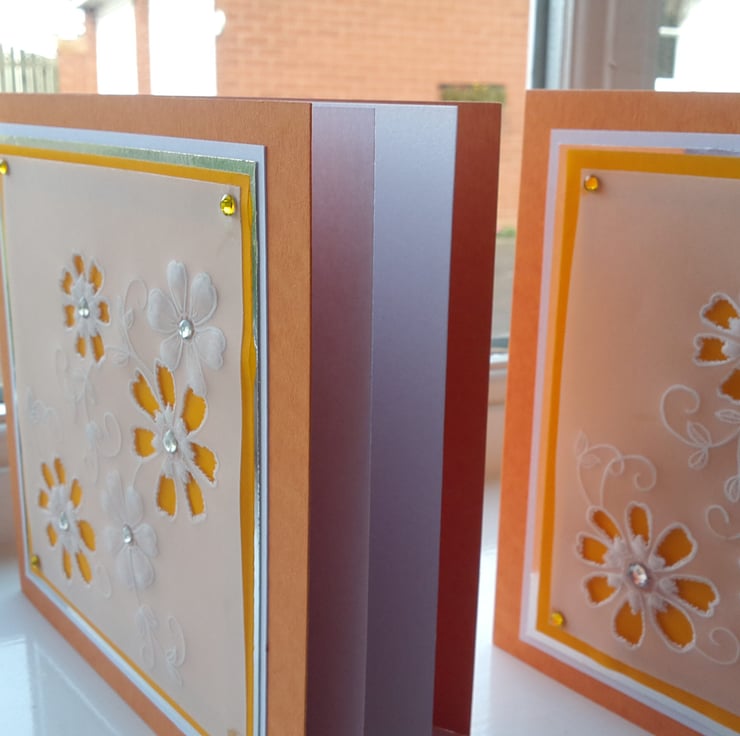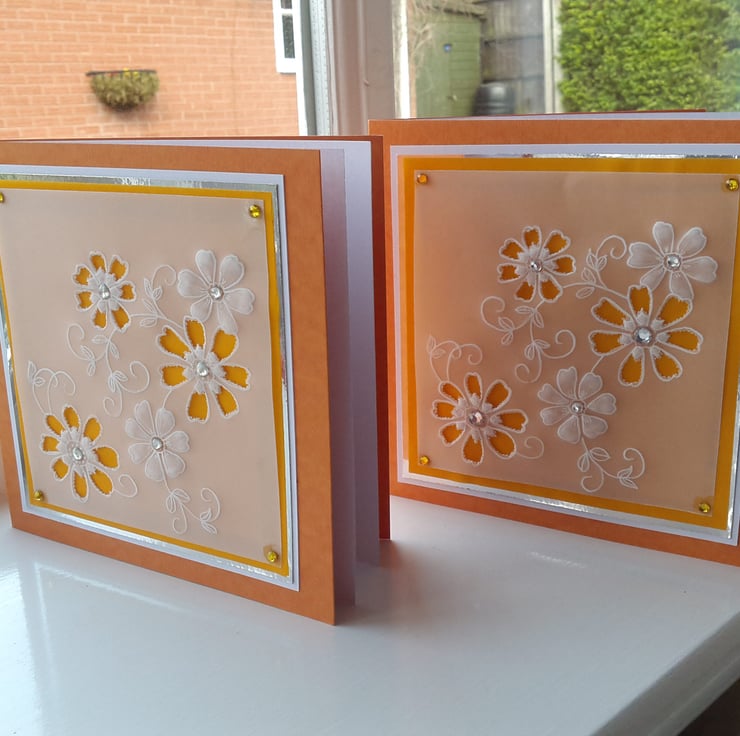 A set of two matching completely handmade and uniquely designed cards using parchment into a pretty Daisy design. Mounted onto orange vellum, silver Morris, white card and then onto orange card. Finished off with crystal stones and optional orange ribbon bow.