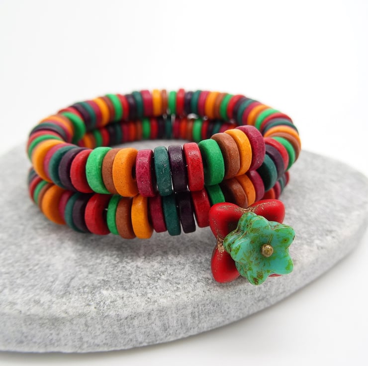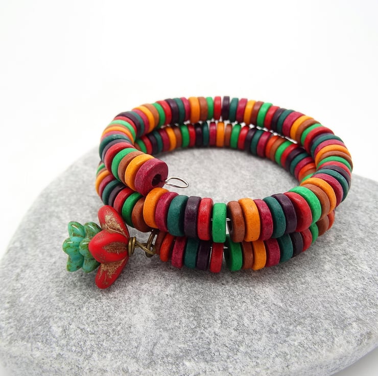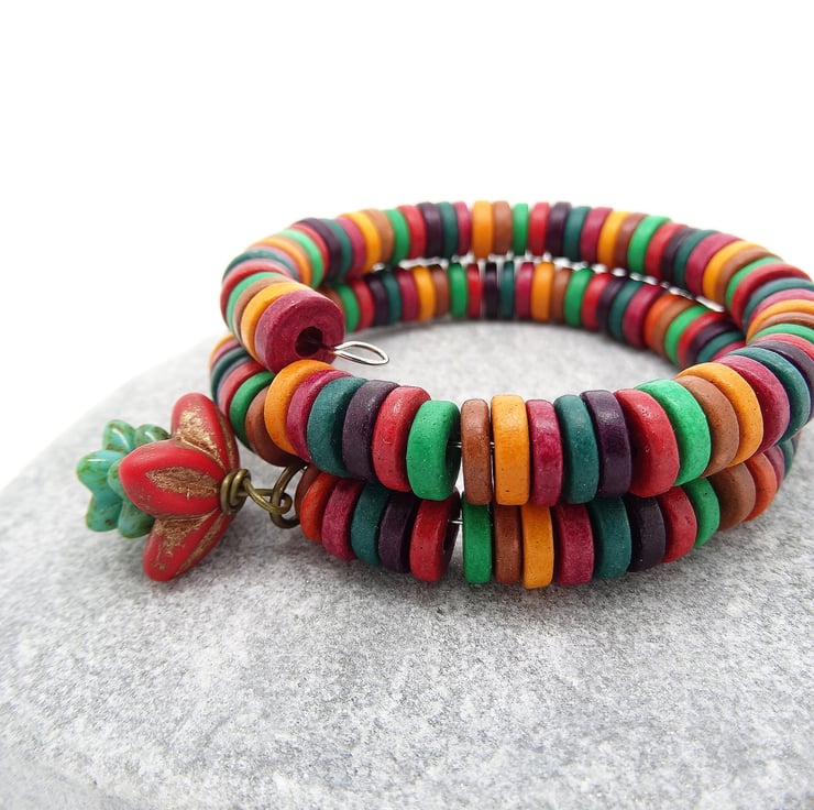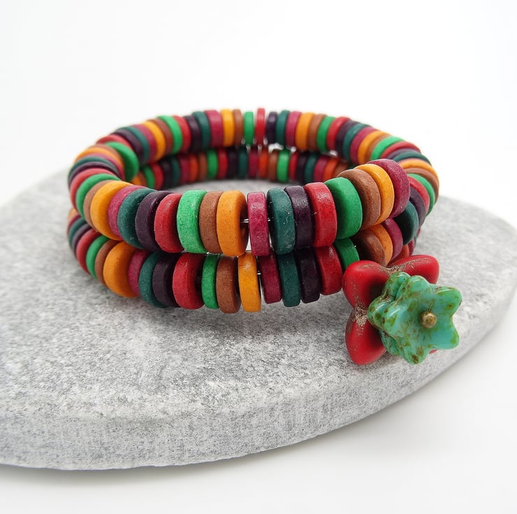 This is a beautiful bracelet in the most vivid, bright colours. I have used Greek, Mykonos Ceramic washers to make the bracelet in red, orange, teal, tan, green and heather. I have made a dangle charm using a 16mm antique red czech glass petal bead and two 10mm green/turquoise petal beads. The bracelet just wraps around the wrist and as I have used Memory Wire it will keep it's shape, it will fit wrist sizes small and medium. As all of the items in my shop are unique, individual pieces made by myself, this is the bracelet you will receive. It will arrive gift wrapped in tissue paper and a organza bag.