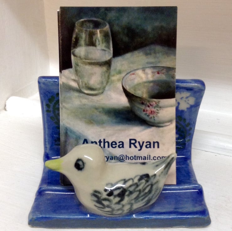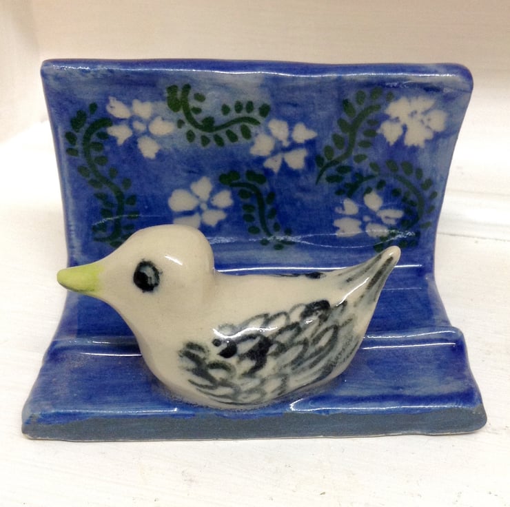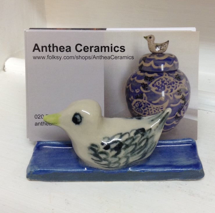 Cute and unique ceramic business card holder with decorative little bird in the front. The holder is entirely hand made and sculpted and made of tough stoneware clay. It measures 8 cms long, 5 cms deep and 5 cms high.