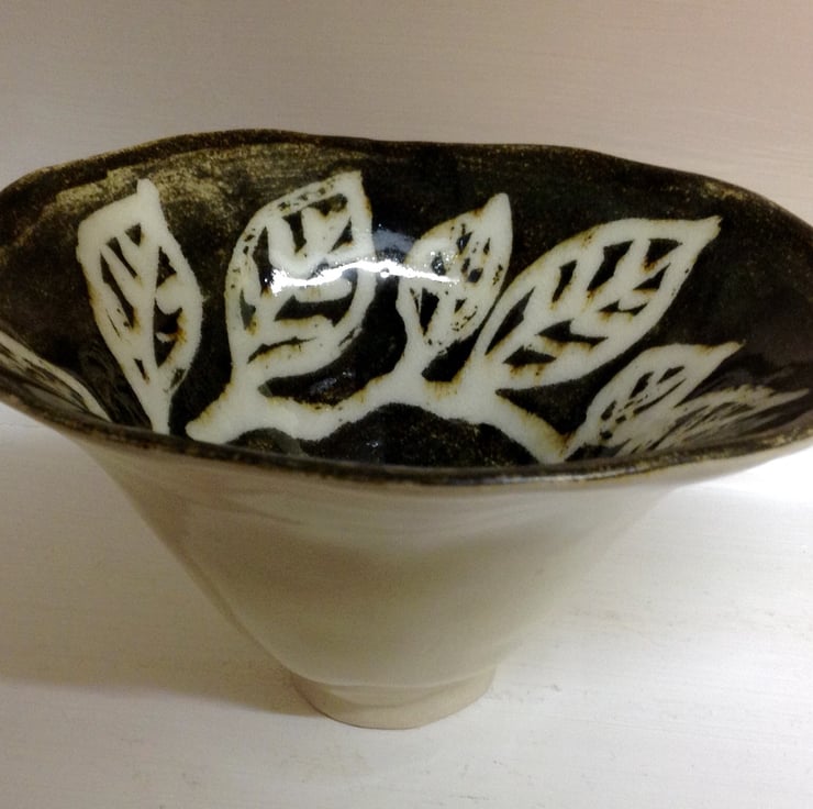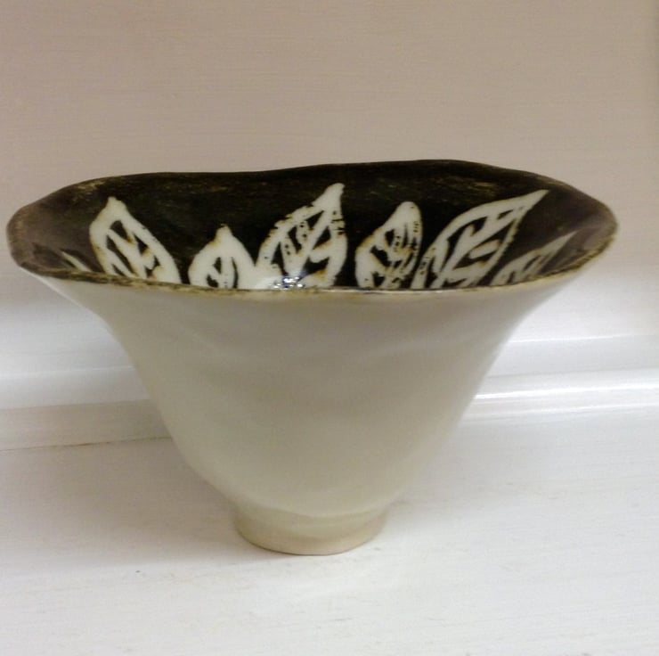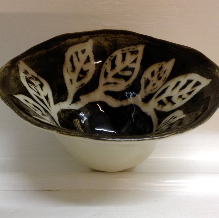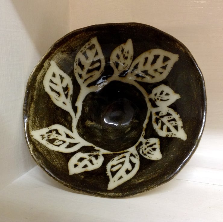Handmade 'pinch pot' in stoneware clay with leaf decoration in brown iron oxide. The bowl measures 14 cms across and is 7.5 cms high. Great for nuts, dips, crisps and nibbles etc. and sweets of course! It is made of tough stoneware clay and is microwave and dishwasher safe.