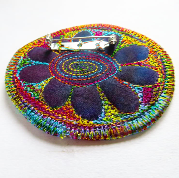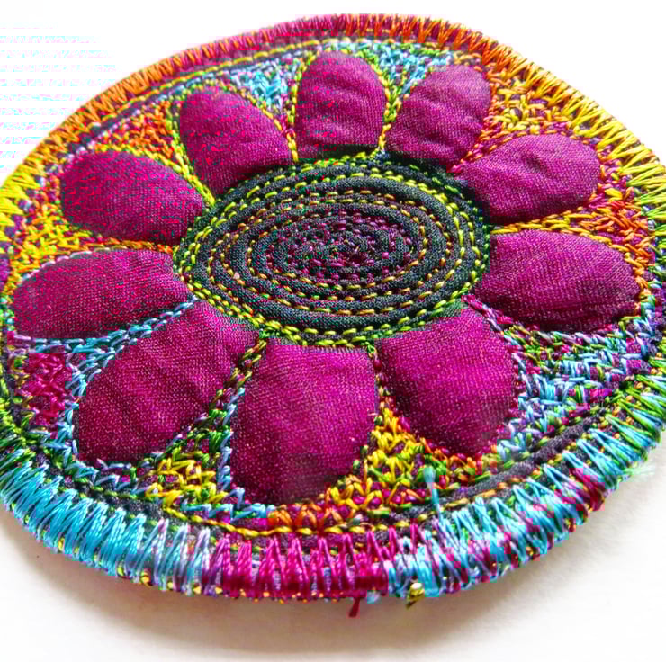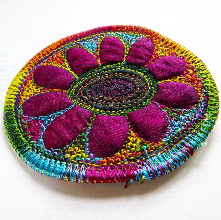 This brooch is made from layers of fabric including silk and hand dyed Egyptian cotton