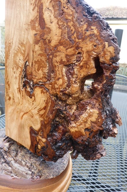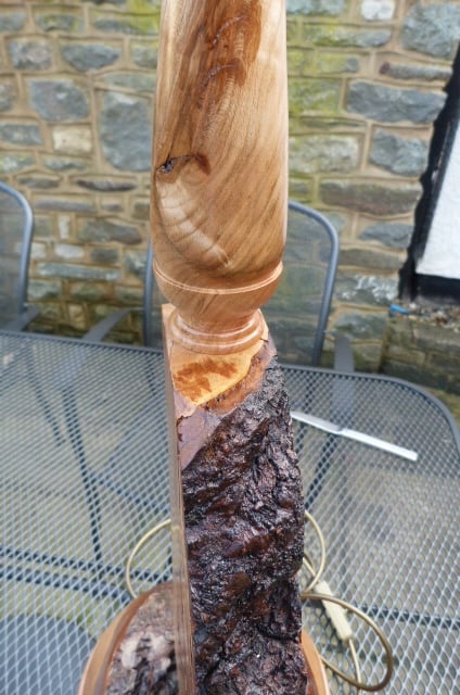 THE MAIN BODY OF THIS LAMP IS FROM THE ROOT OF A CHERRY TREE, THE BASE WITH BARK AND TOP SECTION FROM THE TRUNK OF THE SAME TREE. TURNED AND SANDED TO 1200 GRIT, THEN SIX COATS OF DANISH OIL APPLIED FOR THAT DEEP LASTING LUSTRE. THE BASE IS 9-1/2'' IN DIAMETER AND HEAVY, TOTAL HEIGHT WITH BRASS WORK 32'', WIRED WITH PLUG AND INLINE SWITCH