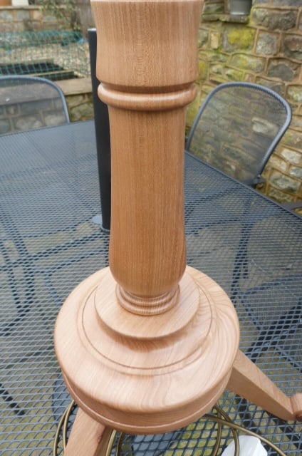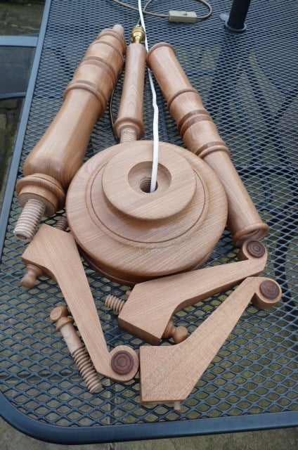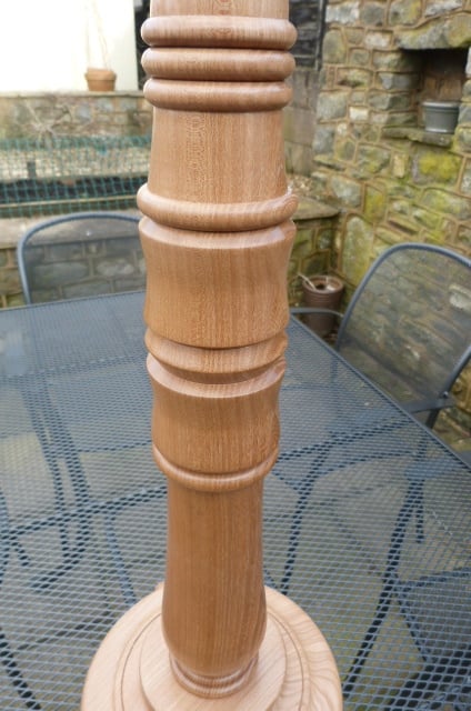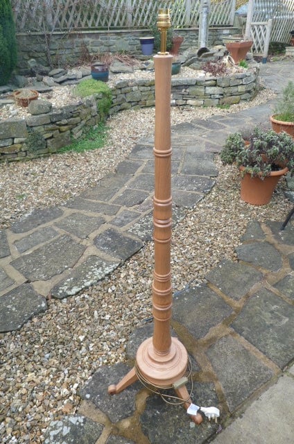 ENGLISH ELM STANDARD LAMP ON TRIPOD FEET, MADE OF ELM THROUGHOUT THIS PIECE JUST SCREWS TOGETHER IN A MATTER OF MINUTES, THREADS ARE CUT DIRECTLY TO THE TIMBER , NO METAL OR PLASTIC PIECES, WILL BE DELIVERED IN A PURPOSE MADE PLYWOOD BOX, 4'-6'' HIGH, 1'-5'' WIDE AT THE BASE,FINISHED IN DANISH OIL AND WOODWAX, PLEASE NOTE THIS ITEM HAS BEEN TESTED, ALL ELECTRICAL COMPONENTS, CABLE, INLINE SWITCH, PLUG, BRASS LAMP HOLDER,ARE PROVIDED, THIS PIECE MUST BE REWIRED BY A QUALIFIED ELECTRICIAN THE SELLER IS NOT RESPONSIBLE FOR REASSEMBLY.