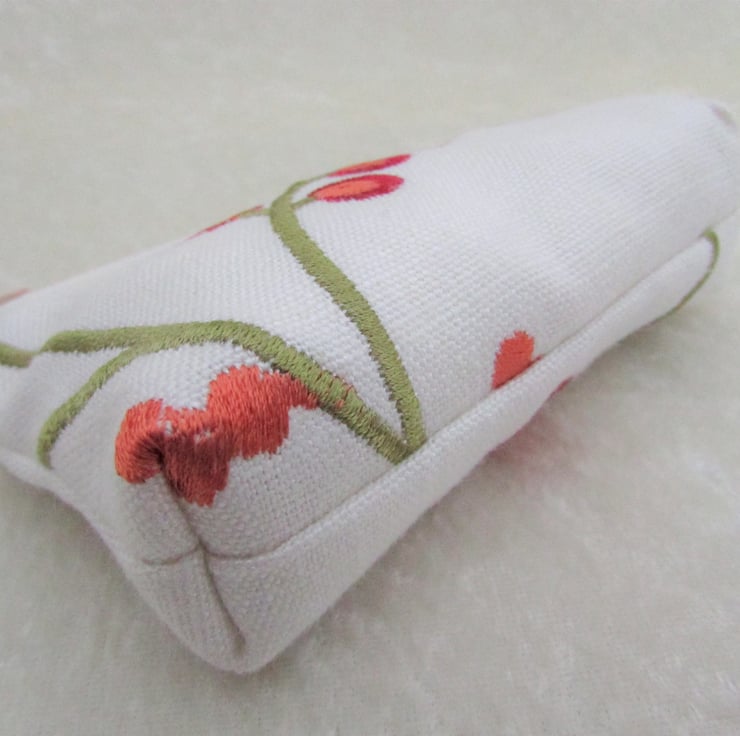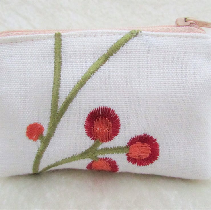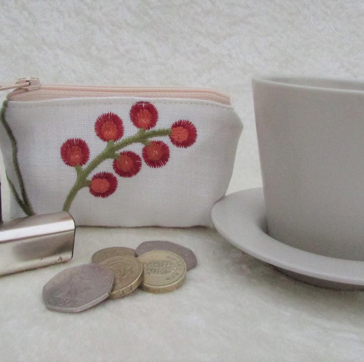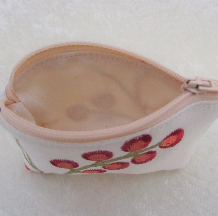 A lovely small purse in cream embroidered fabric featuring a spray of red and orange flowers on a pale green stem . The coin purse has a cream zip and is fully lined with cream fabric. The base of the purse is boxed to give extra space inside.