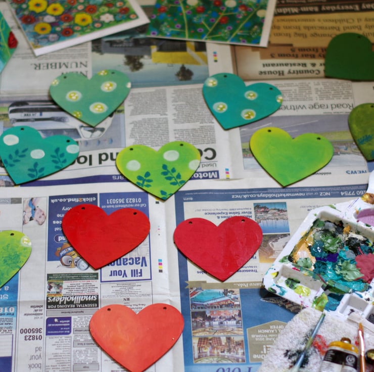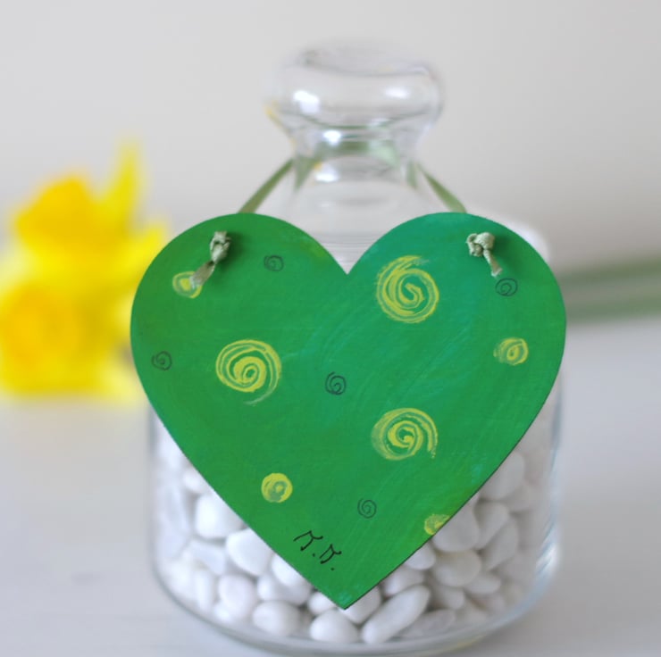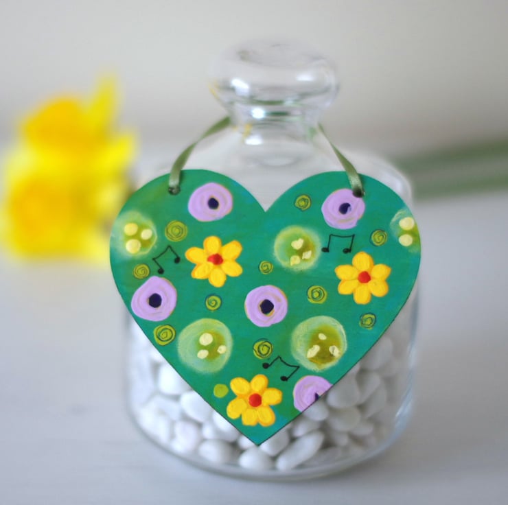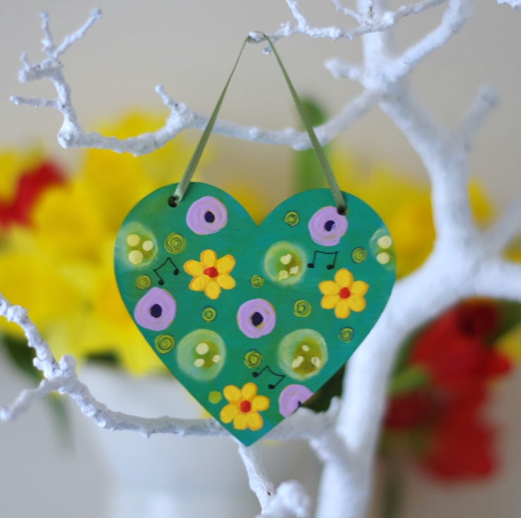 This green hanging heart with yellow and purple flowers is hand painted by me in acrylic paint on plywood surface and it is varnished for protection on both sides. The reverse is painted in green and signed and it has some decorative motifs. The floral heart measures approx 4" x 4" (from widest to longest point) and the edge is 2mm. Please note that due to being hand painted, it may have traces of paint on the edge. The heart looks like a mini painting and it is perfect as a spring, Easter or summer decoration and it could bring joy to any room all year round.