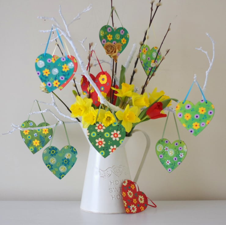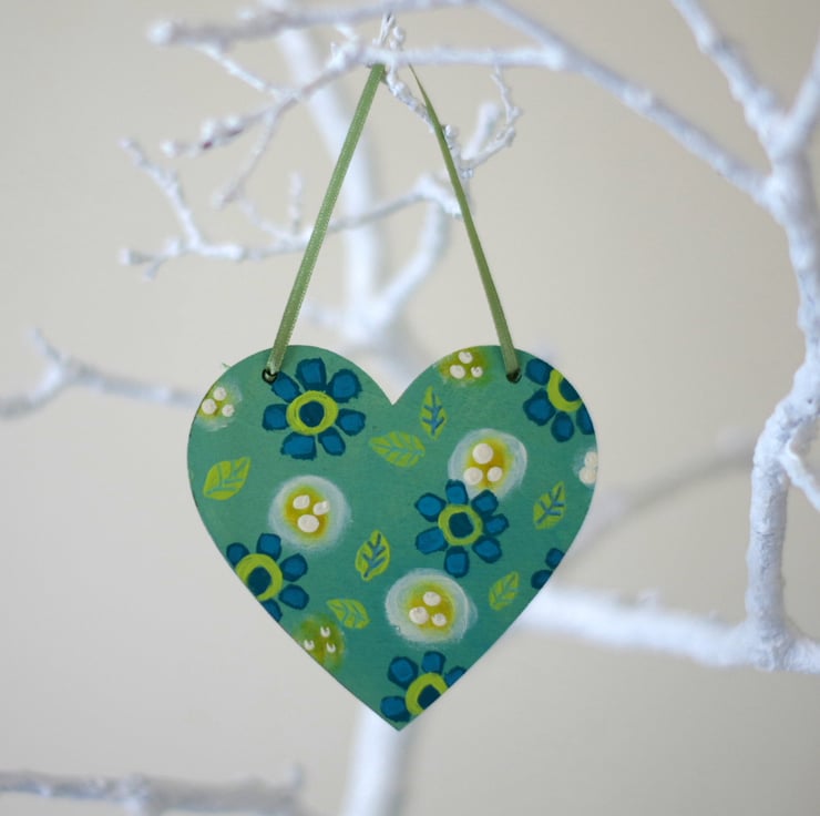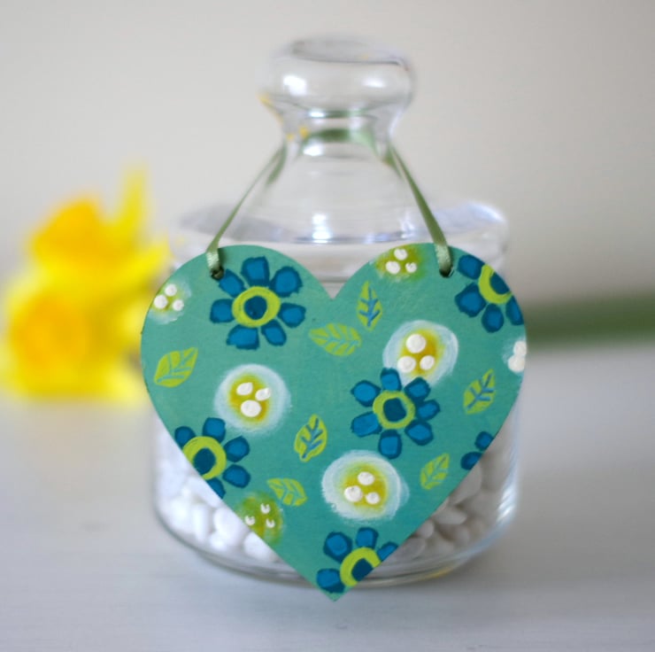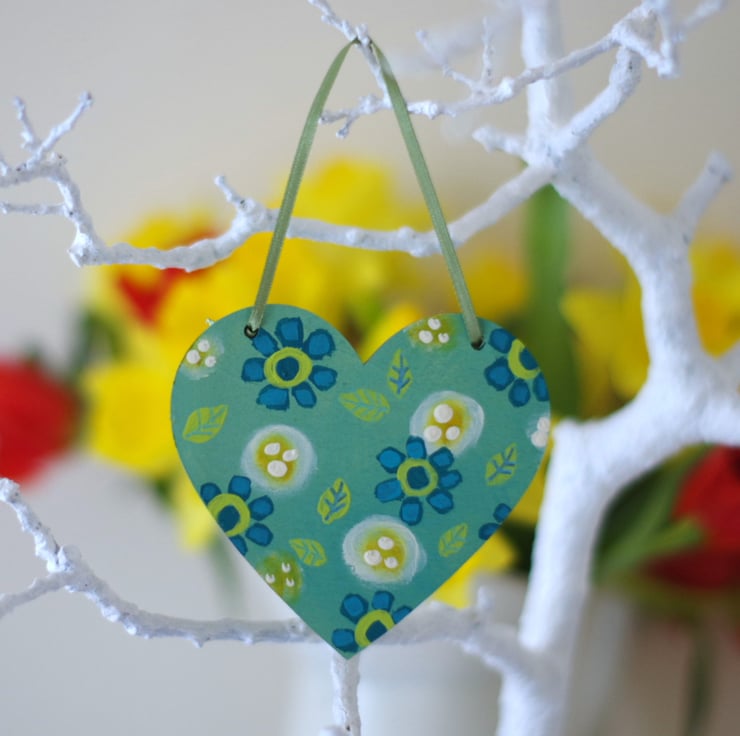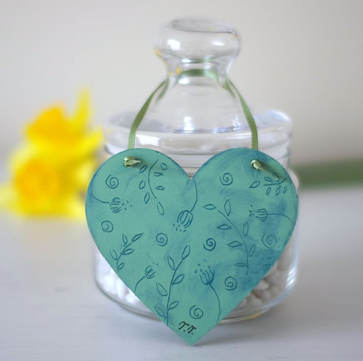 This mint green hanging heart is hand painted by me with acrylic paint on plywood surface and it is varnished for protection on both sides. The front features turquoise flowers, dandelions and leaves patterns and the reverse is painted in mint green and it has some plants patterns in sgraffito technique. The spring floral heart measures approx 4" x 4" (from widest to longest) and the edge is 2 mm. Please note that due to being hand painted, it may have traces of paint on the edge. The heart looks like a mini painting and it could bring joy in any interior all year round.