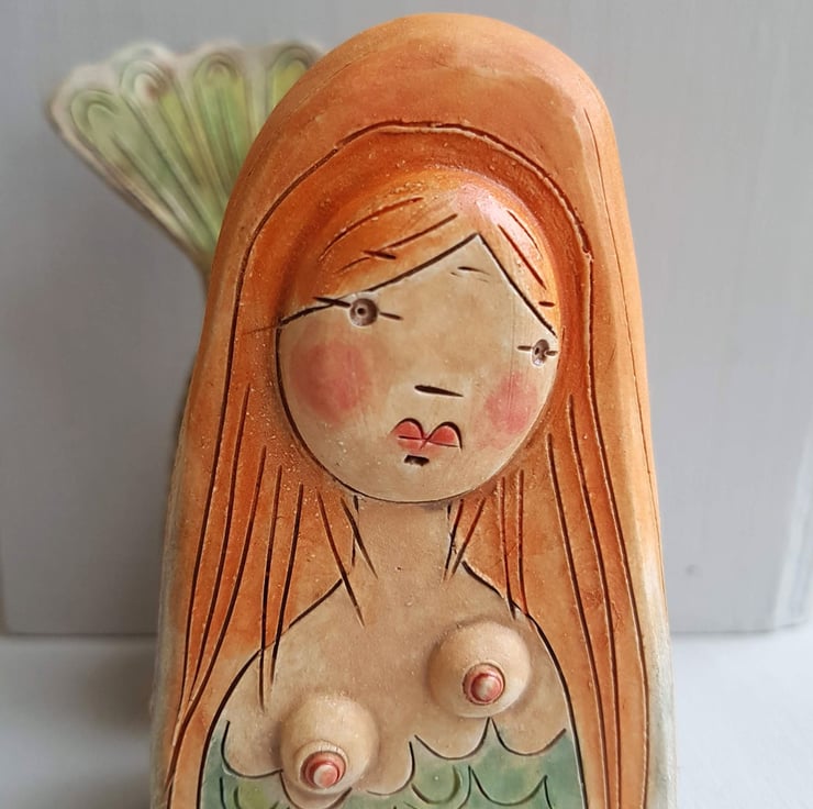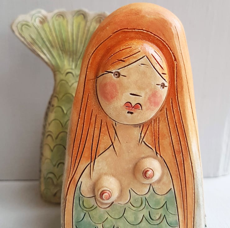 This little mermaid figurine is glazed on the reverse with a glossy transparent glaze to suggest that she has freshly emerged from the water, her tail shimmering behind her. Turquoise and green glazes are mingling over her tail and scales and her hair hangs down over her back, where sea flowers cling to her tresses.