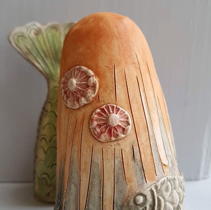 A handbuilt stoneware sculpture decorated with incised marks and underglaze colours fired to 1155 degrees centigrade.