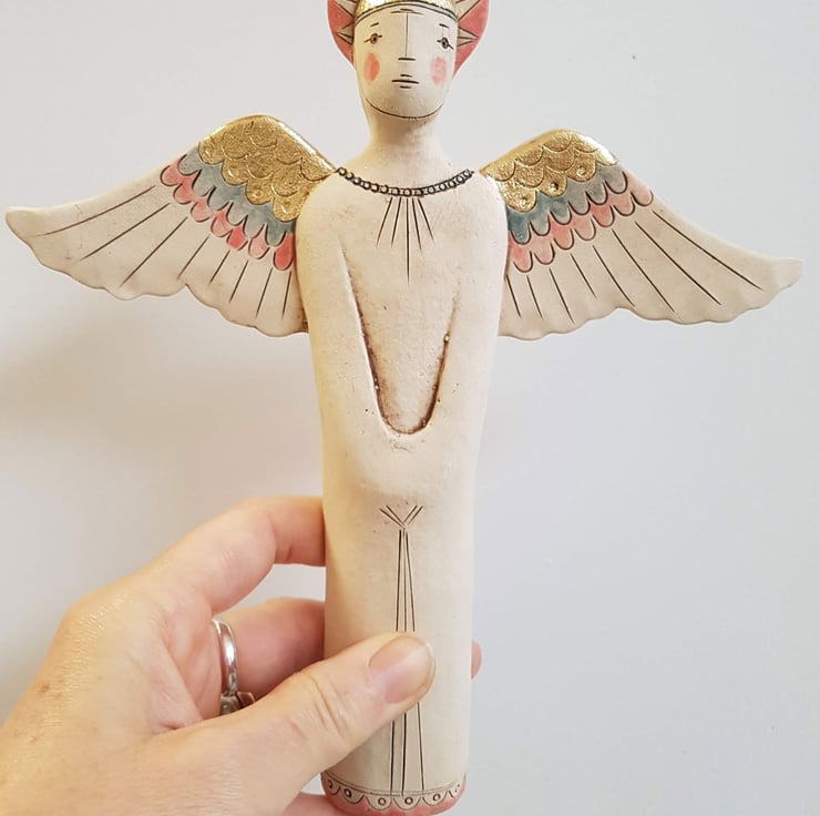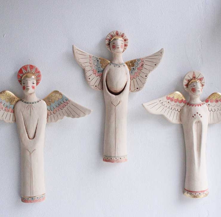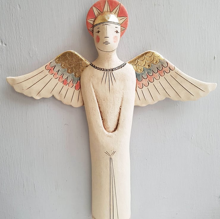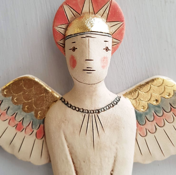 Once fired the piece is gold leafed and a wire hanging arrangement is attached to the reverse so the finished sculpture can hang simply from a nail in the wall.
