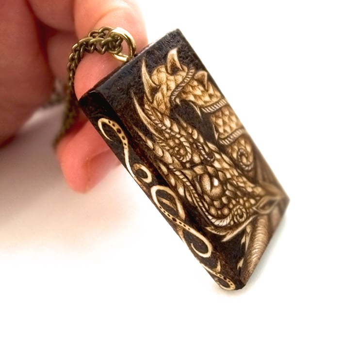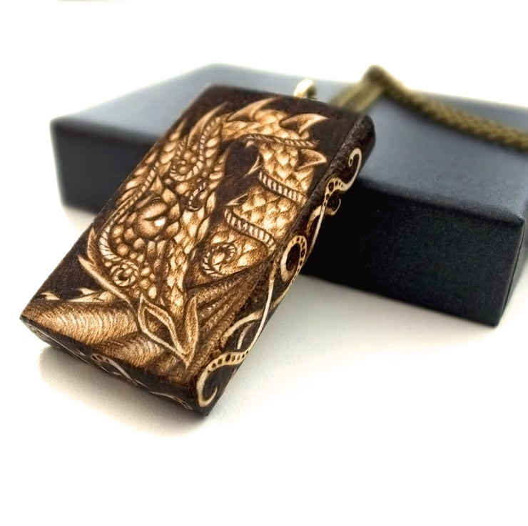 Here we have a stunning curious dragon, coiled around this large, chunky wood pendant, an ideal gift for a dragon lover. The design is achieved using hand wood burning or pyrography, decorated on all edges and sides except the reverse, which I have initialed, SB for Sarah Bell.
