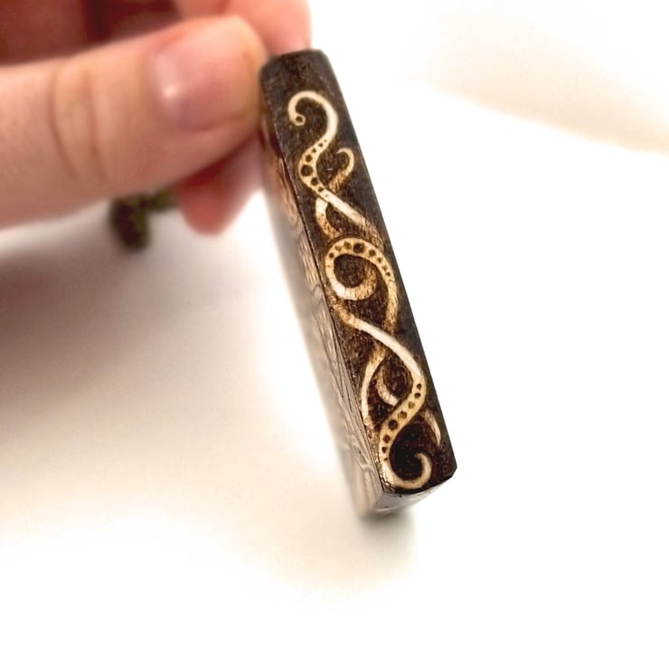 The design and composition is my own, I do not use and stencils, templates or transfers. The wood is a beautiful sycamore, with a gorgeous finish. The approximate pendant size is: 32mm X 50mm. To care for your pyrography pendant, store in a box or roll when not in use, keep nice and dry and avoid spraying with perfume,