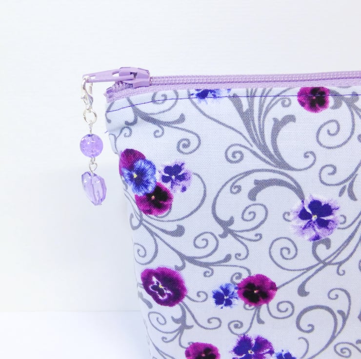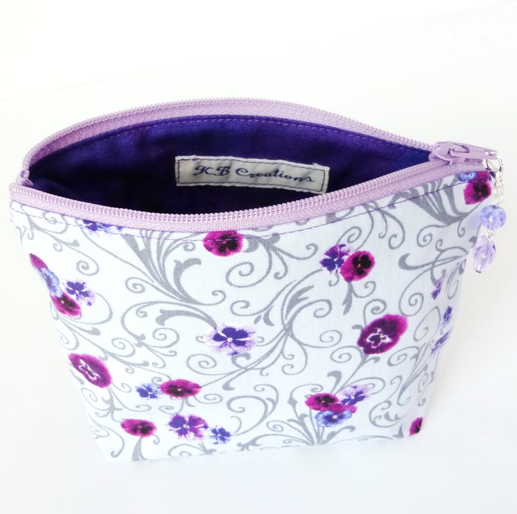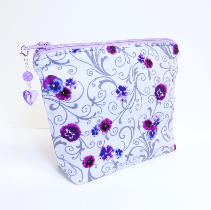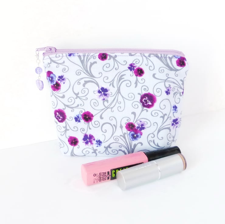 This is a small sized make up bag, made of a 100% cotton fabric in shades of purple and plum on a grey background.