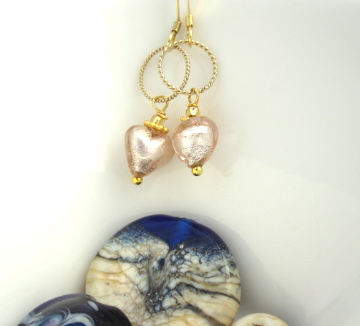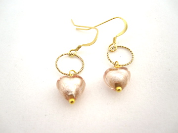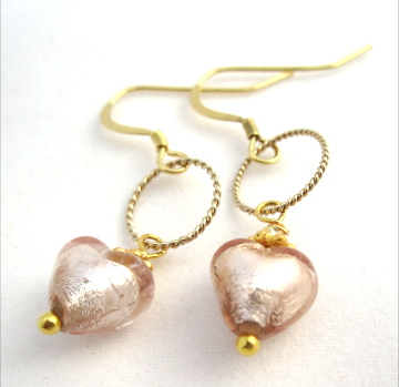 Champagne Pink Venetian Glass Heart Earrings with gold plated silver Hoop detail. Sweet Drop Earrings, Champagne coloured jewellery.