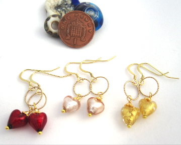 Even at my age, I am a hopeless romantic, full of Hearts & flowers - like these tiny sweet heart and gold plated silver earrings. Ideal for a wedding on a gold plated sterling silver hooks or posts, they are light & wearable. The little hearts are Venetian Murano glass - if you want another colour - just mail me & I will check the glass drawer.