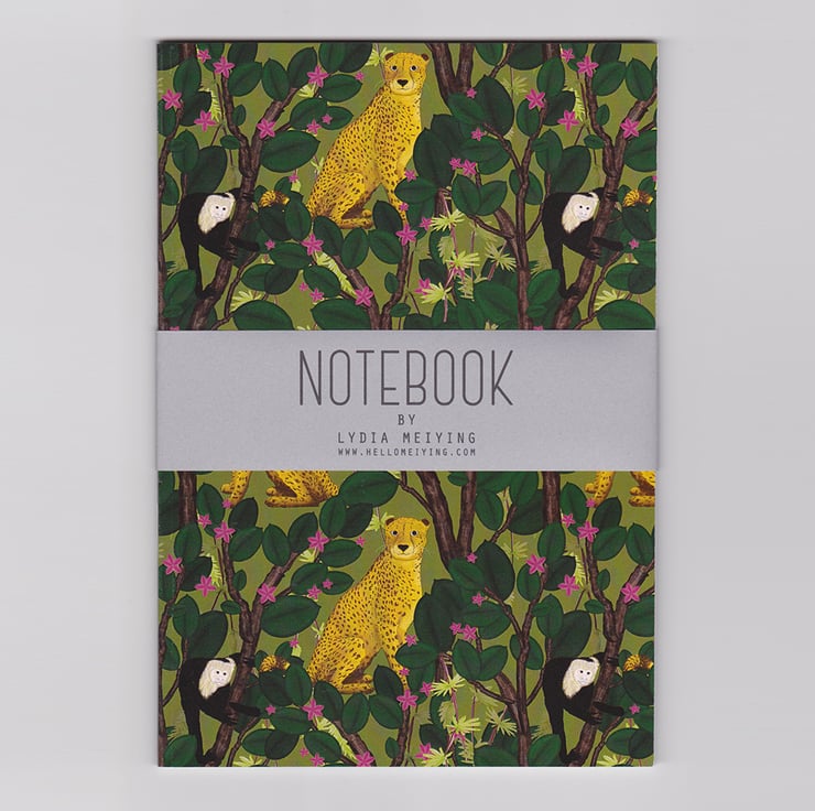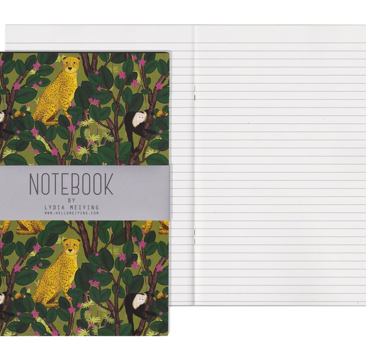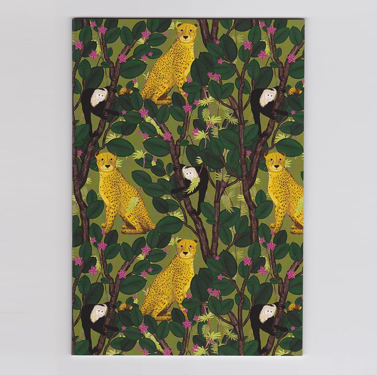 An A5 notebook with lined pages. The cover features a hand drawn pattern of cheetahs and monkeys amongst the trees.