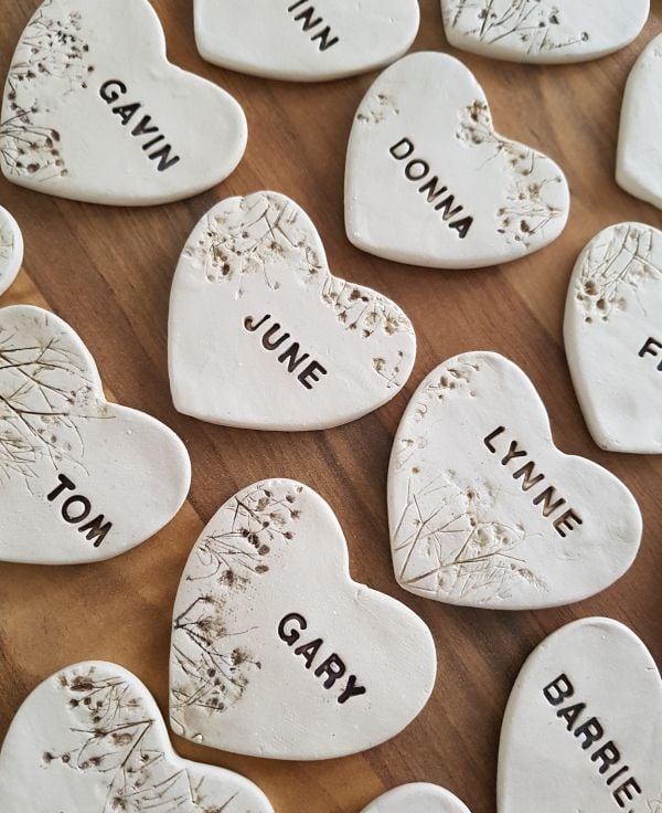 Handmade using an ivory coloured clay, these ceramic hearts are impressed with natural wild flowers and gypsophila, and personalised with any name, initials, word and/or date of your choice.
