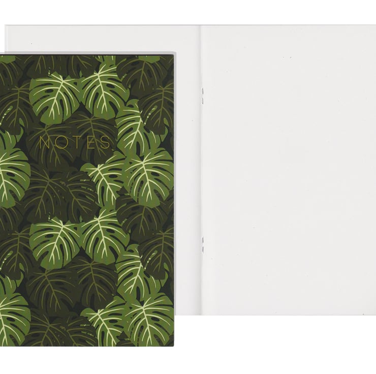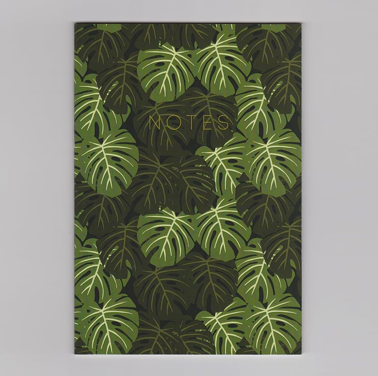 An A5 notebook with plain pages. The cover features a hand drawn pattern of tropical monstera leaves.