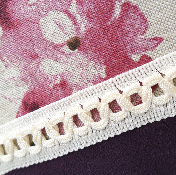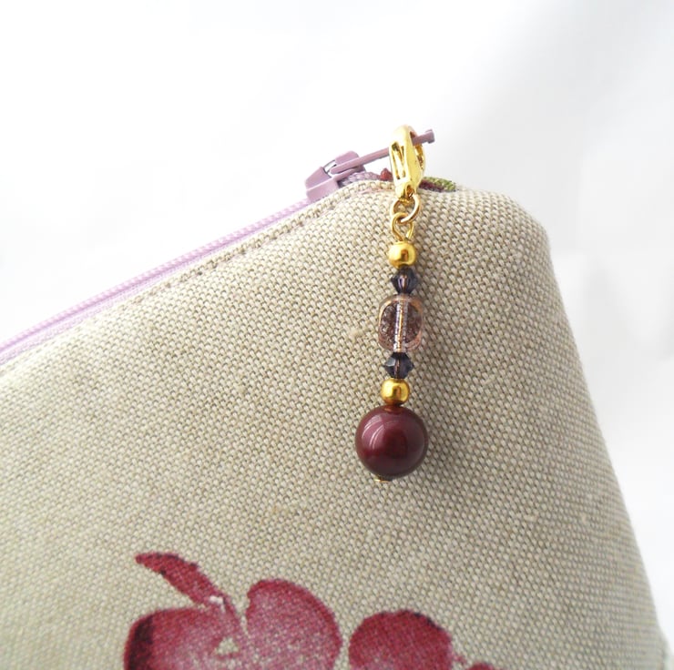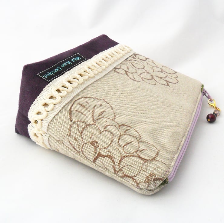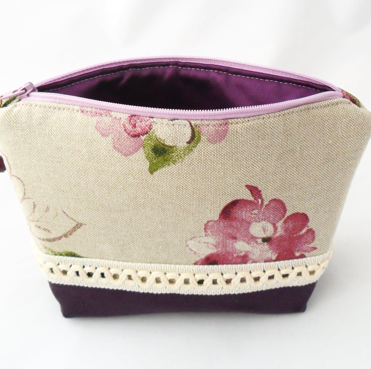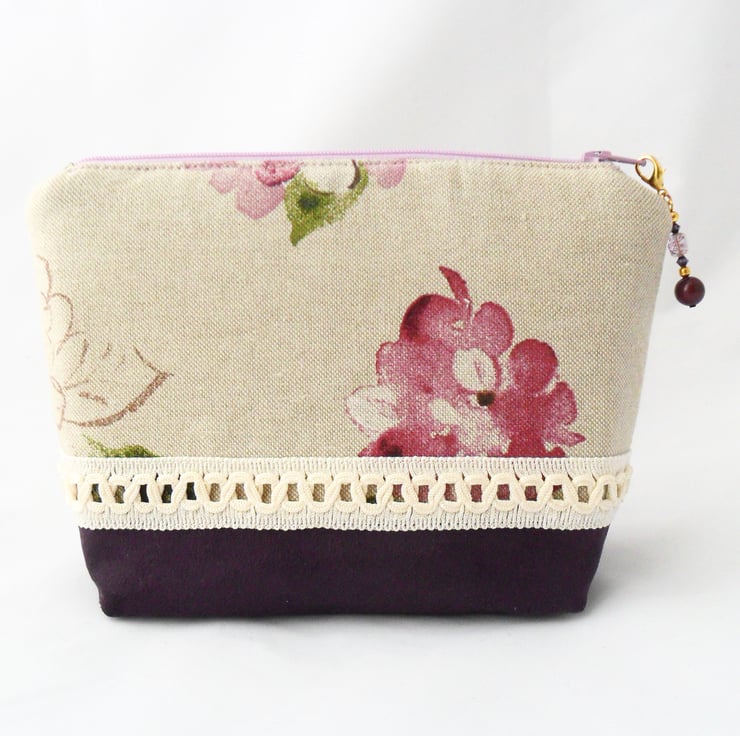 A really beautiful handmade make-up bag in a floral cotton print with a contrasting purple faux suede panel at the base and an ivory braid trim. The make-up bag is lined in a purple duchess satin, and the lilac zip has a handmade beaded zip pull with purple and gold beads.