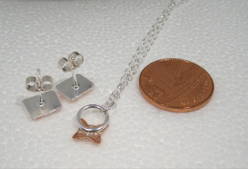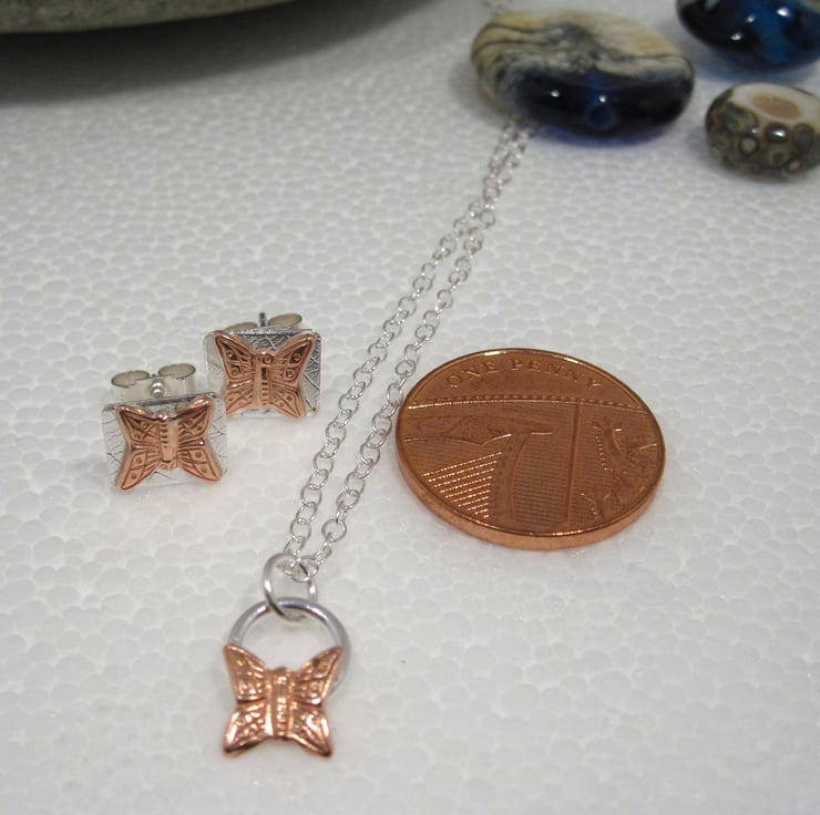 Carefully Soldered copper butterfly on silver, this tiny Necklace and earring set - is delicate enough for everyday wear. One only.