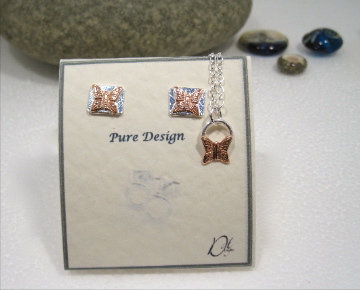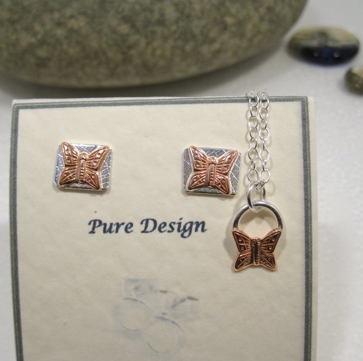 Butterfly Necklace and Earring Jewellery Set Copper & Silver Pendant . Stud earrings.