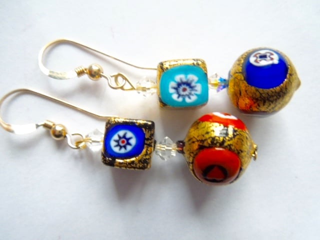 Murano glass earrings with 24k gold foiled gold Murano glass cube beads which have a different decorations on each side and matching Murano glass 24k gold foiled round bead also decorated with sparkly Swarovski crystal beads. The beads are beautiful and no two are the same as they are handmade. The earrings hang from 14k gold filled ear wires and measure 30mm in length. These gorgeous and unusual earrings are presented in a pretty gift pouch.