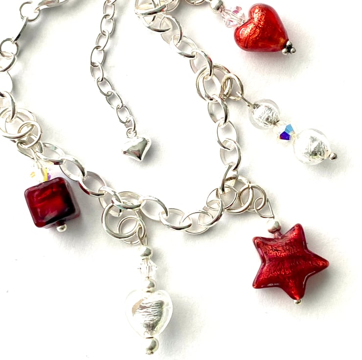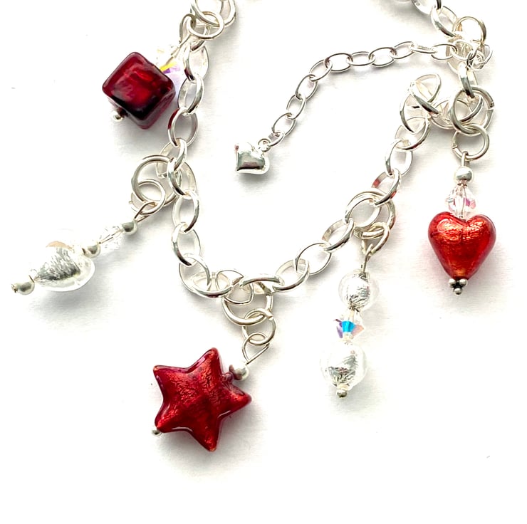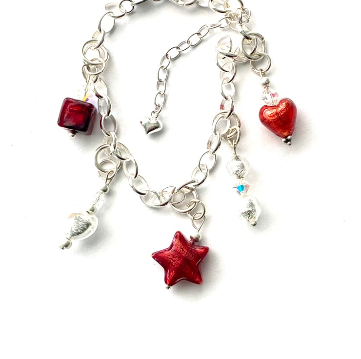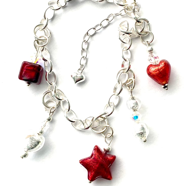 Sterling silver and red Murano glass charm bracelet with a pure silver foiled Murano glass star bead, a pure silver foiled Murano glass red cube bead, a pure silver foiled silver Murano glass cube bead and a Murano glass red heart bead with matching round bead. The bracelet also has a pure silver foiled Murano glass round bead and sterling silver round beads with glittering Swarovski crystal beads. The sterling silver bracelet measures 19cm. in length and has an additional extender chain measuring 4.5cm. This fabulous bracelet is presented in a velvet gift pouch.