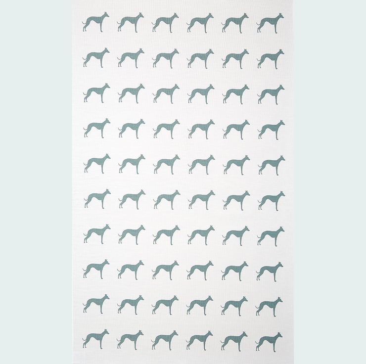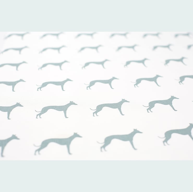Here's what every sighthound owner has been waiting for! A tea towel with a repeat pattern of a whippet in silvery grey. Hand printed on the sunny south coast of England by me in my garden workshop!!