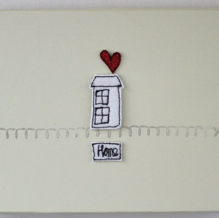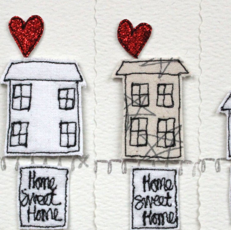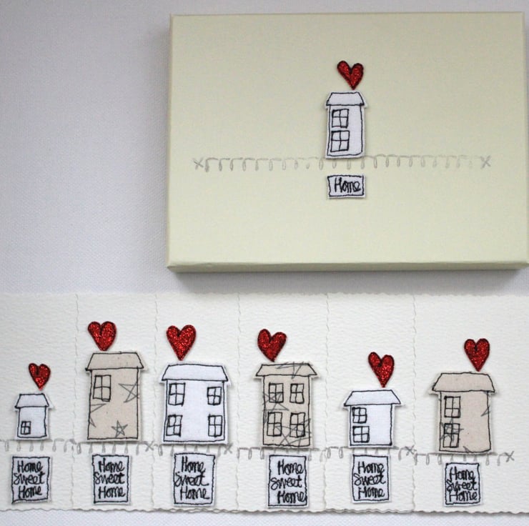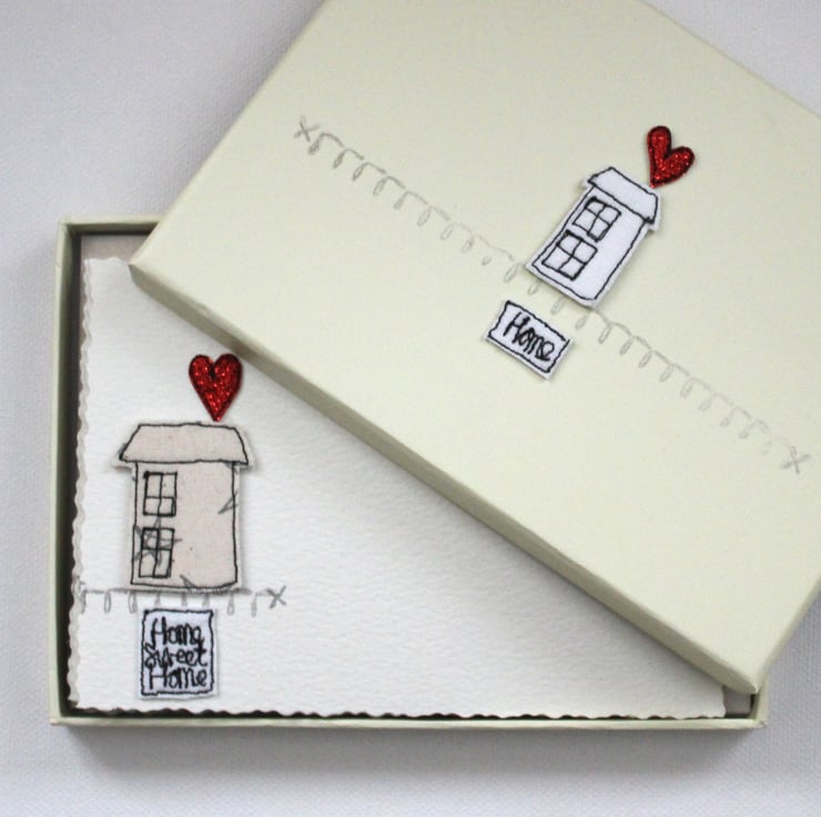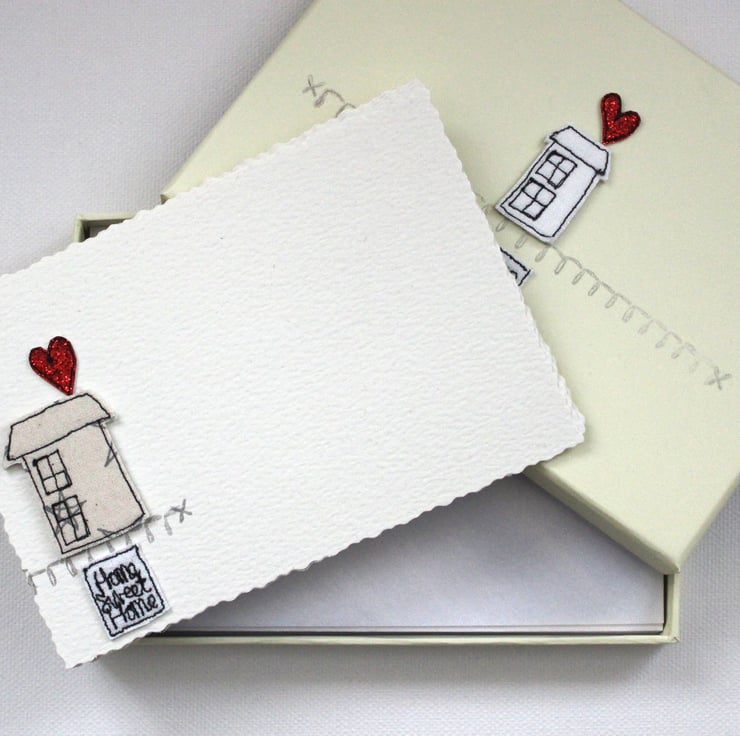 'Home Sweet Home', contains six deckle edged postcards measuring 15cm x 10cm, with matching envelopes. Each postcard has a sewn little house, red glitter heart, 'Home Sweet Home' banner and a printed curly line.
