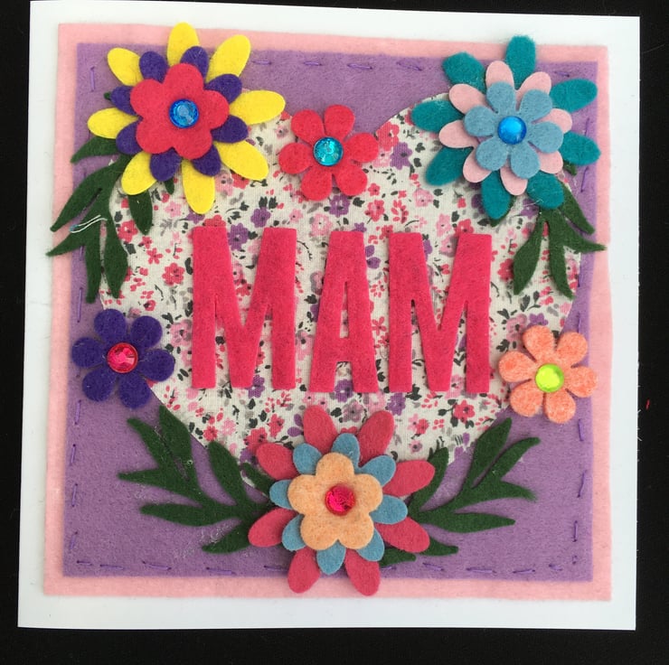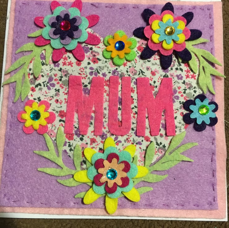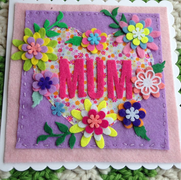 A lovely felt and fabric machine and hand sewn Mum card, perfect for Birthday or Mothers day