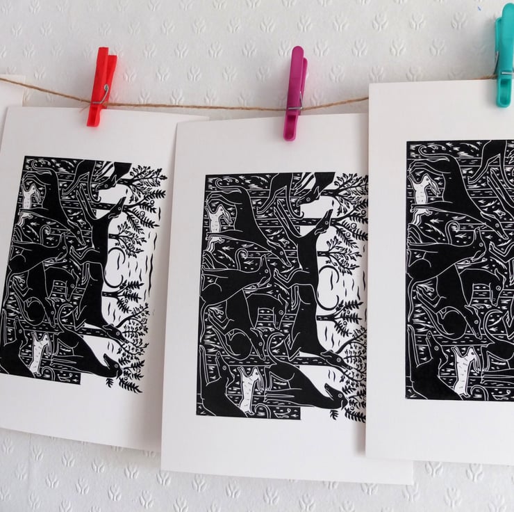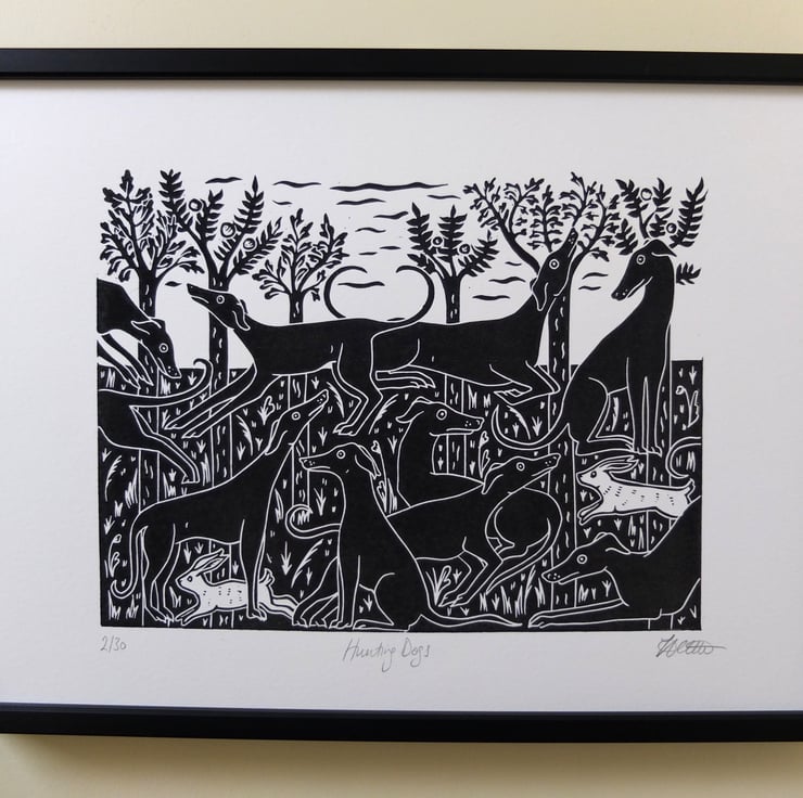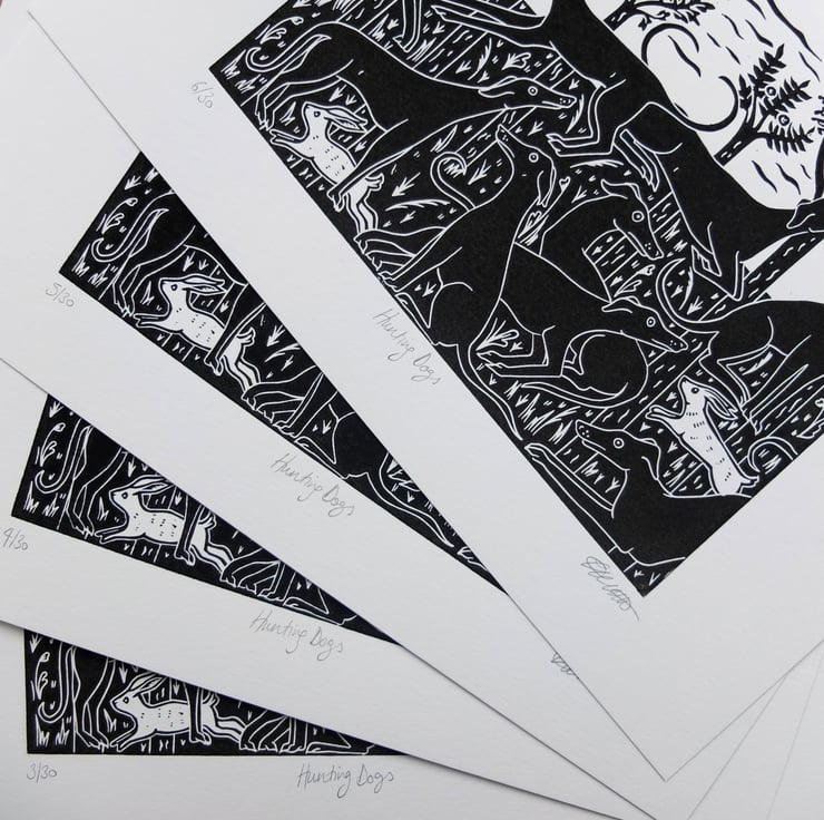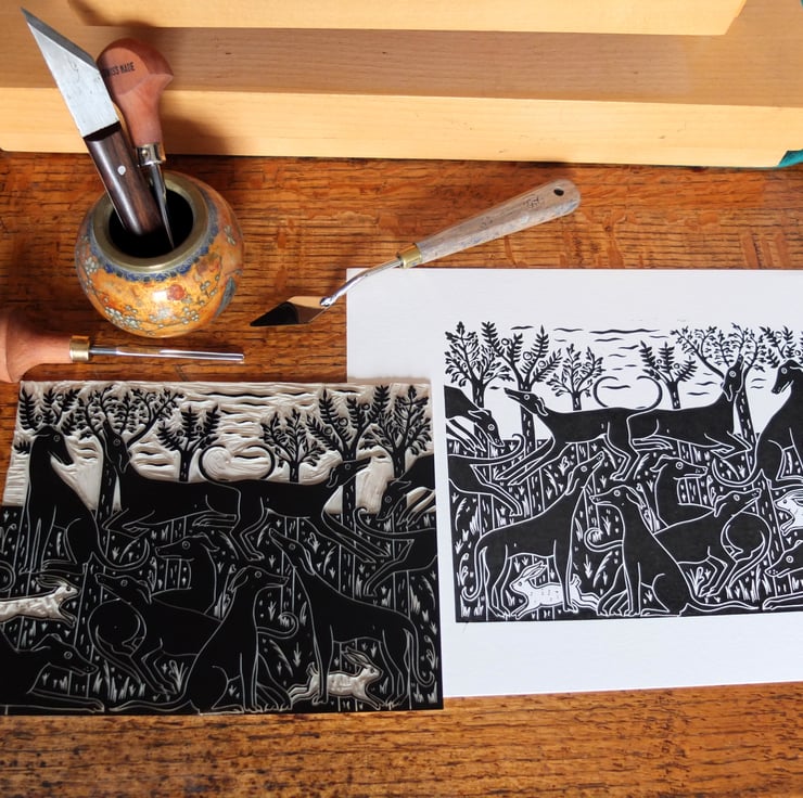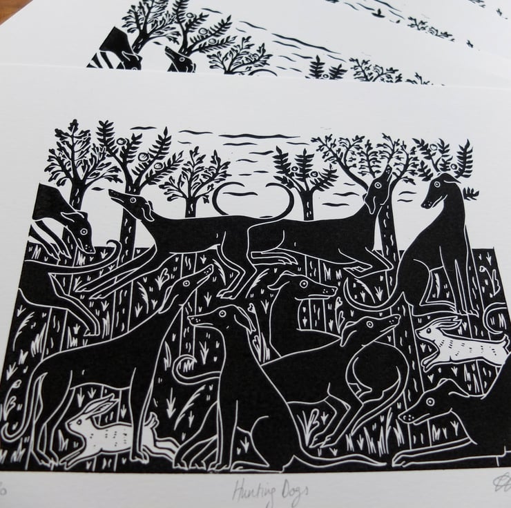 At home I have a slinky black greyhound/saluki cross and I've wanted to use him in one of my designs. For inspiration I looked at some beautiful paintings of medieval hunting dogs, often shown in groups relaxing in fields. I loved carving each one, with individual expressions and poses that I observe in my own dogs, I especially like the little white rabbits sneaking through the trees!