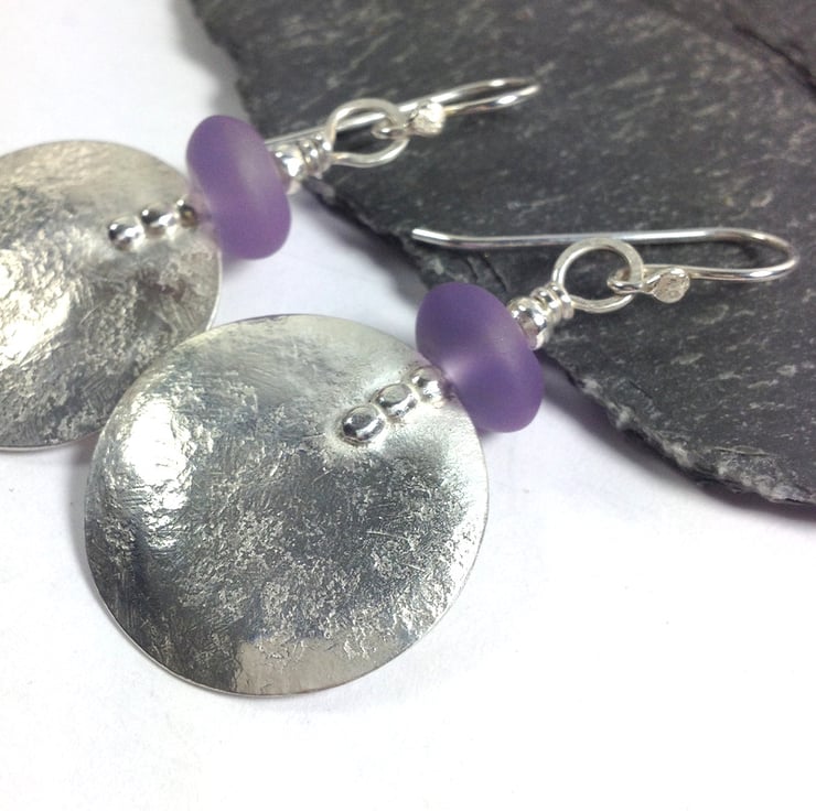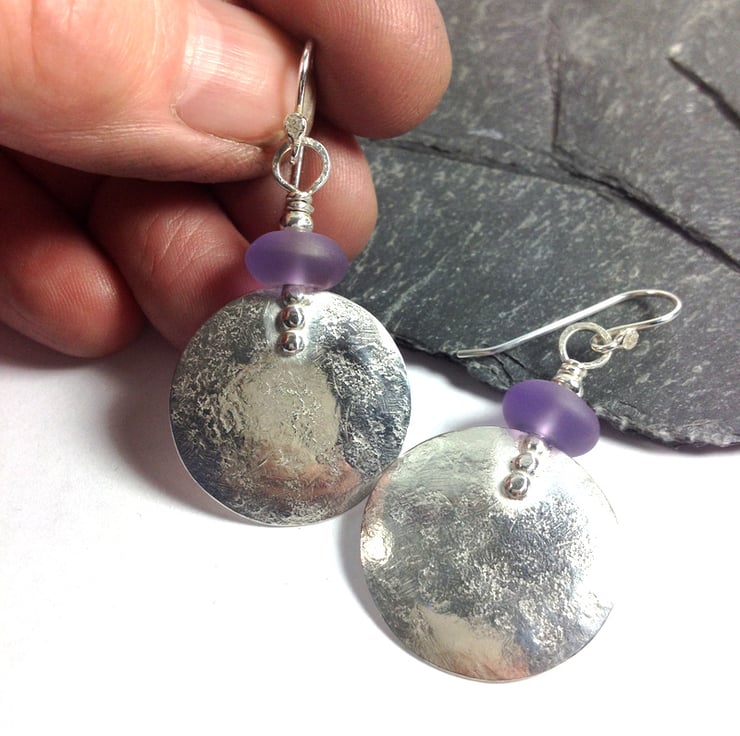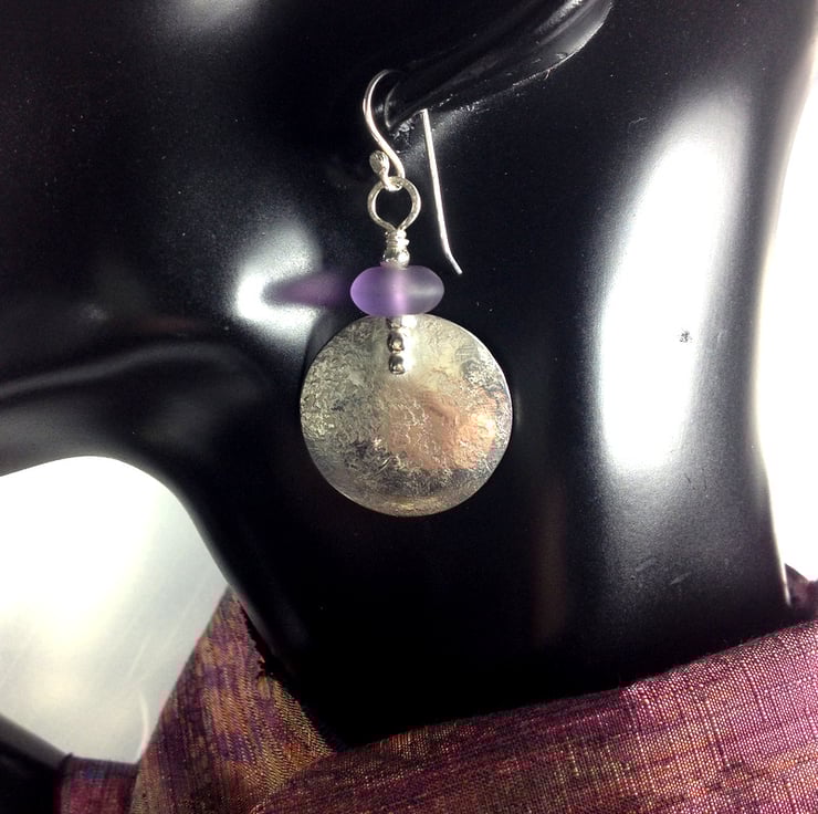 Beaten dished discs of silver have been topped with frosted amethyst beads and hung from handmade hooks.