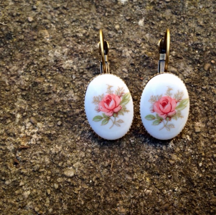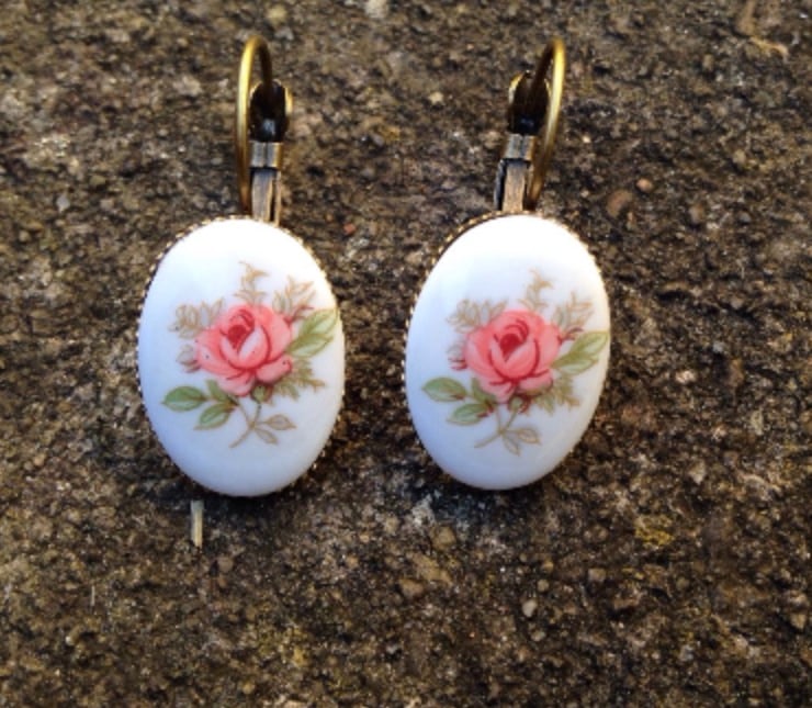 Vintage dainty pinky rose style Porcelain cabochons which are set into bronze oval lever back earrings