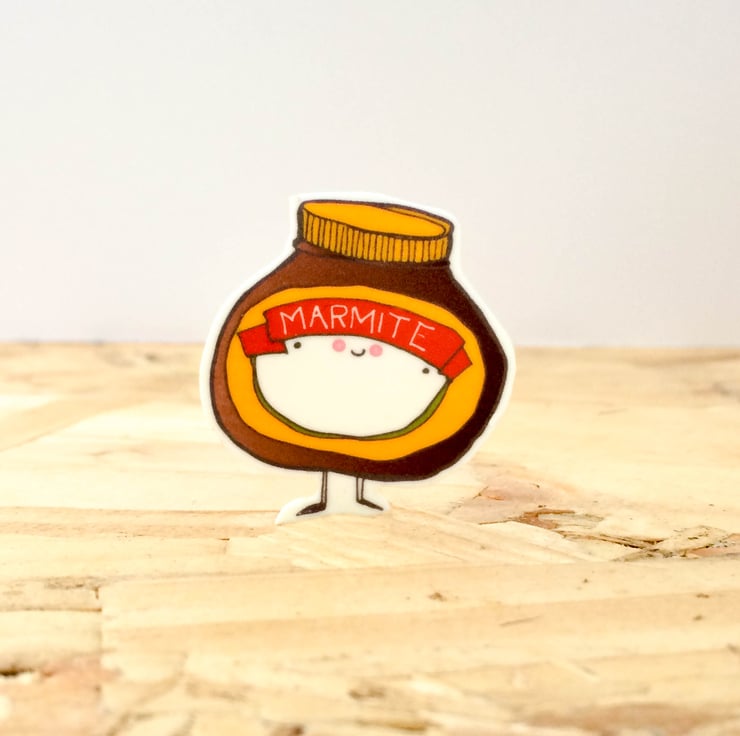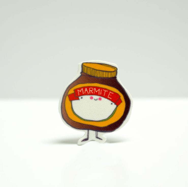 Mr Marmite is printed to shrink plastic, cut out by hand and then baked in a hot oven to shrink and harden. Once cooled he is given a few coats of clear matt varnish for protection and then he is mounted on a badge pin ready for wear on jumpers, coats and cardigans!