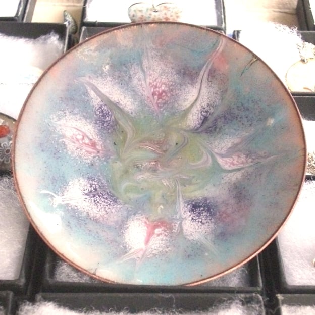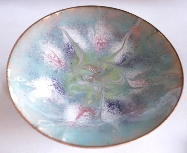 I have built up several base coats of clear enamel over which I have then laid a coat of turquoise. This allows the copper base of the dish to show through in tones of golden brown. On the turquoise coat I have scattered green, gold, white, purple and orchid enamel. Theochid and the purple are transparent enamels; they need a white coat beneath them to allow the colours to show. I have then disturbed the scattered colours by drawing a steel tip through them while the dish was in the kiln at red hot, drawing out a unique random pattern in which the colors mingle. The enamel is not so molten it will flow easily and as it cools while I have the kiln door open it will set smooth but unevenly. This gives a degree of texture to the piece which adds an effect to the play of light on it.