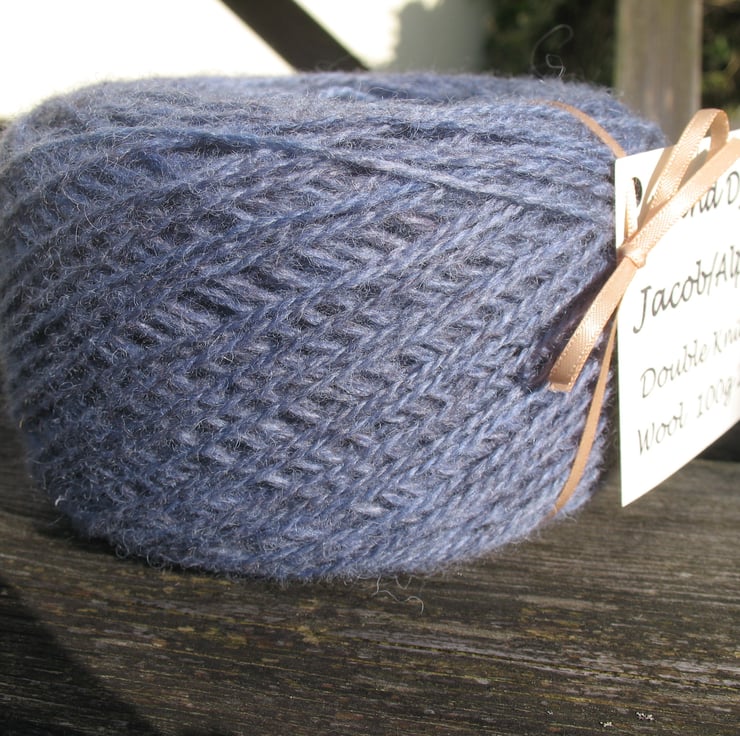 Produced from the fleeces of our small pedigree flock of Jacob Sheep mixed with Alpaca from a local breeder, spun by the Natural Fibre Company in Launceston and hand dyed on our farm.