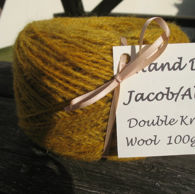 A blend of 80% Jacob and 20% Alpaca white and dark brown fleece in a 7 to 1 ratio overdyed Chamomile. 100g ball, approx 280 metres (300 yards). Hand wash separately at low temperature. A joy to knit and very warm. If you would like a free sample card of all the colours in this range, please send a stamped addressed envelope to Tavistock Tastes and Textures, Tor Grove Farm, Rix Hill, Tavistock PL19 9EQ.