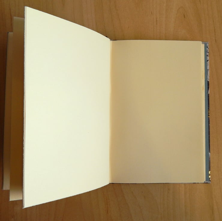 There is a quarter-binding of black leather-like bookcloth, to contrast with the cover paper.