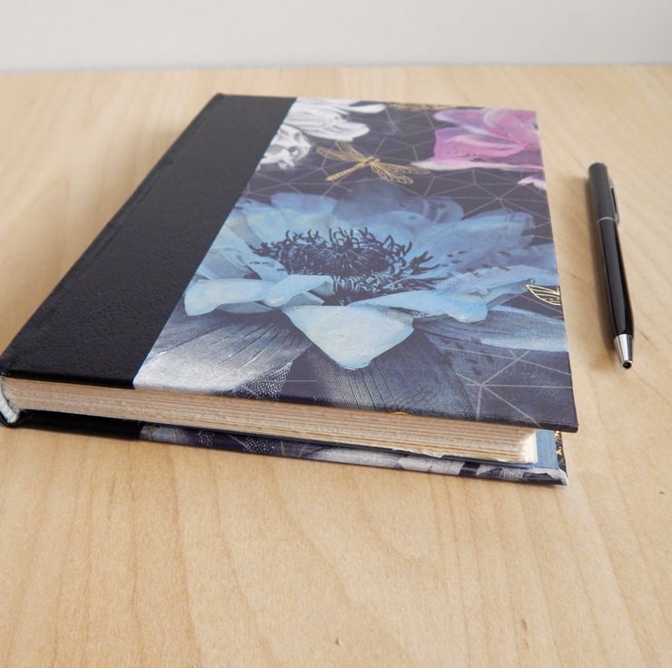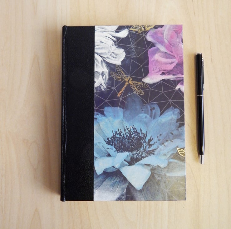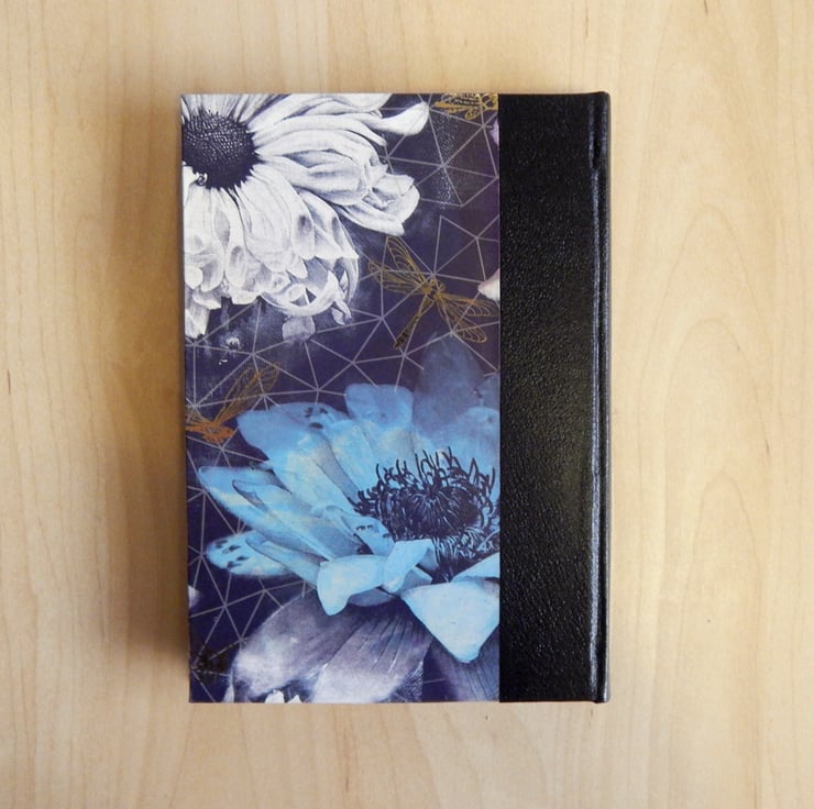 Hand made in traditional style. The covers are of decorative paper, with blue, pink and white flowers on a grey geometric-patterned background. The paper is overprinted with dragonflies, in gold.