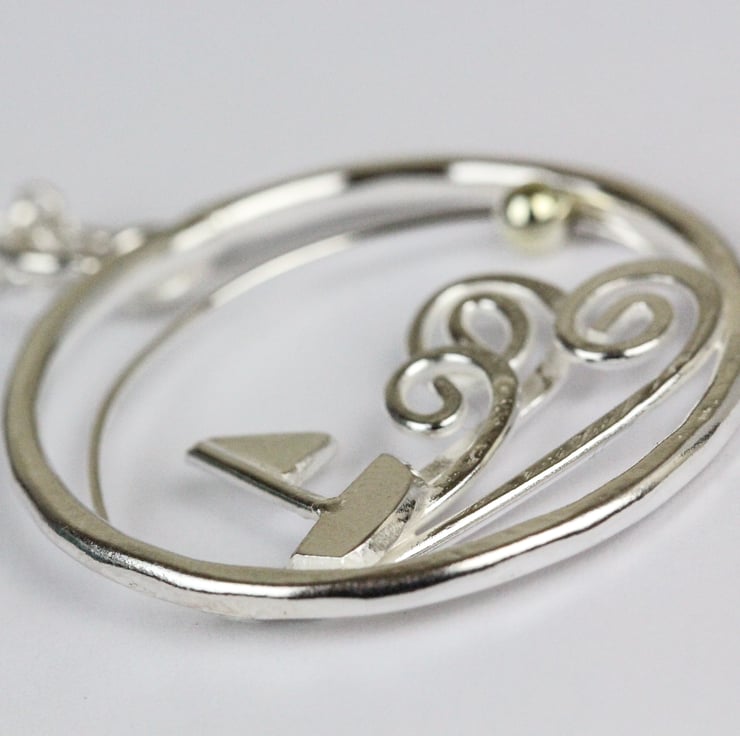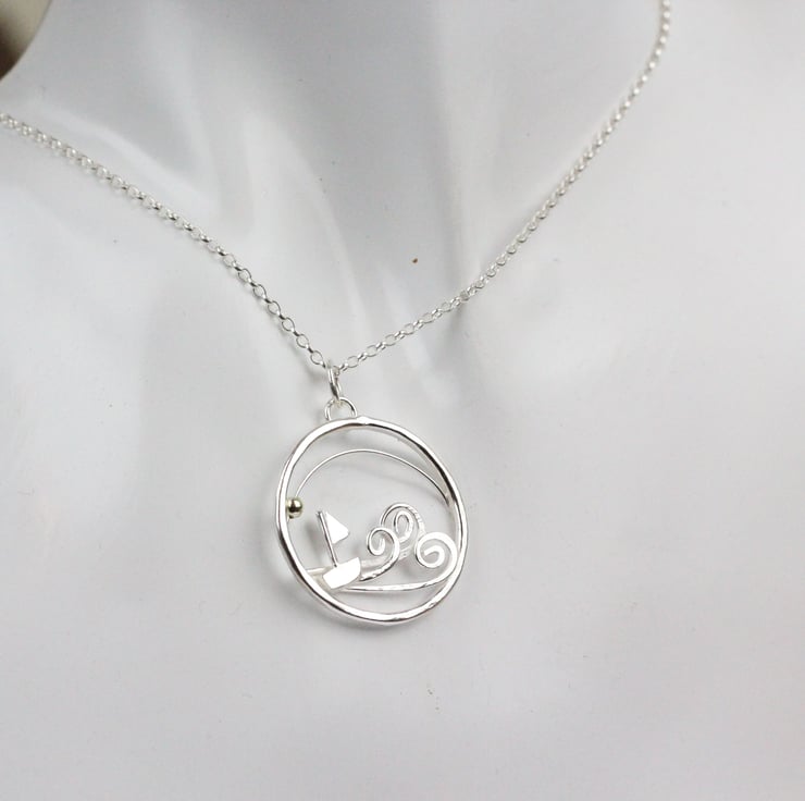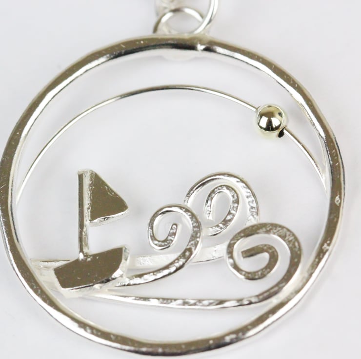 Quirky sterling silver boat and waves pendant, with Kinetic 9ct yellow gold sun.