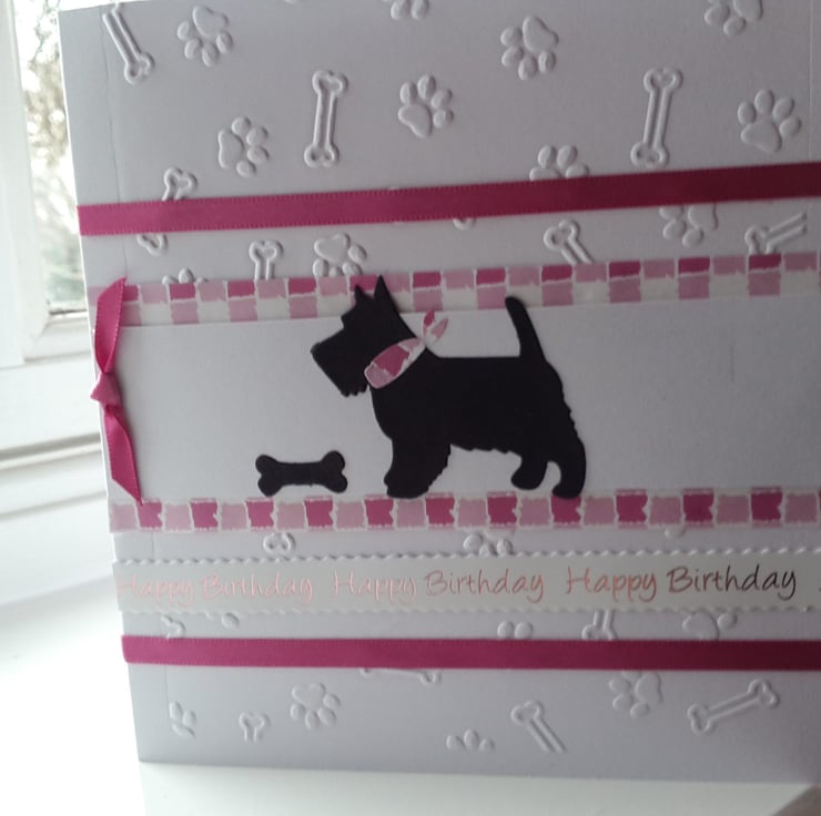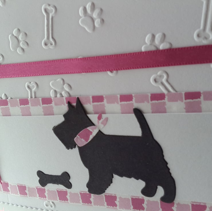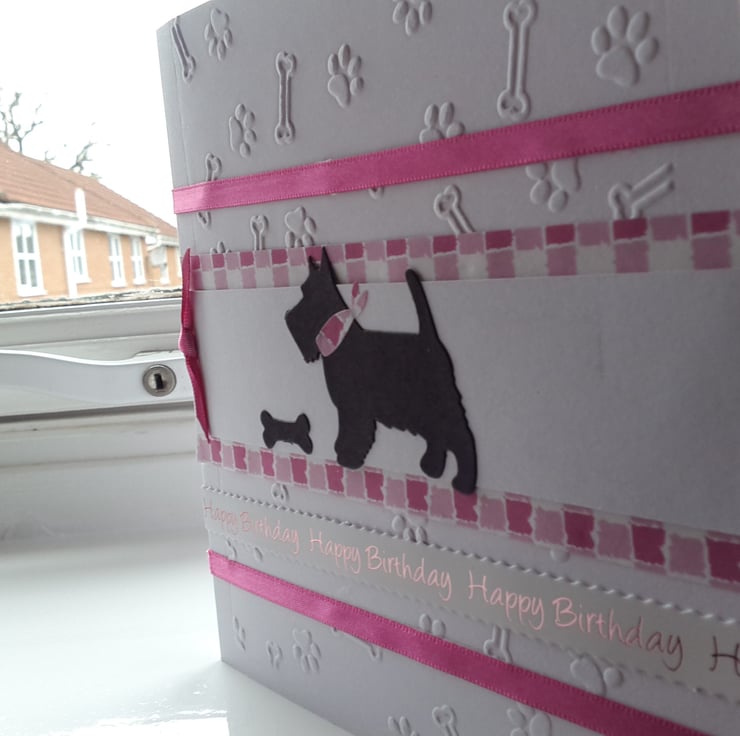 A completely handmade and uniquely designed card. Consisting of a Scottie dog die cut from black card with her bone mounted onto white card, then pink checked card and then onto quality pristine white quality card which has been embossed with bones and pawprints. Finished off with happy birthday and pink cerise ribbon and how