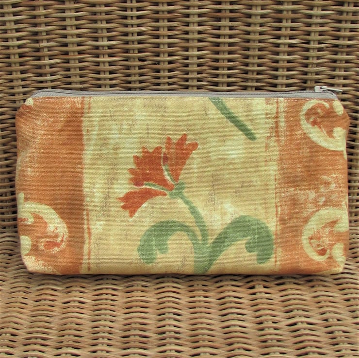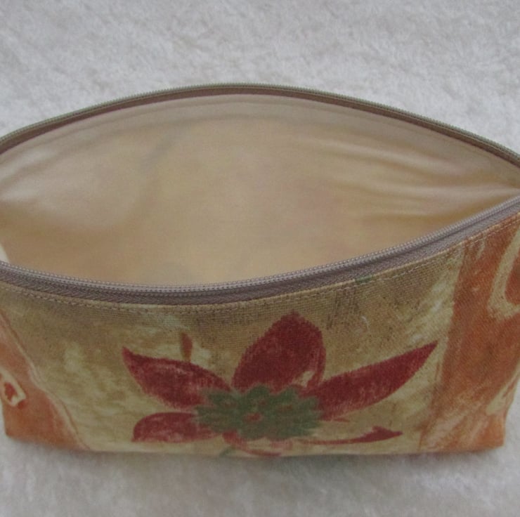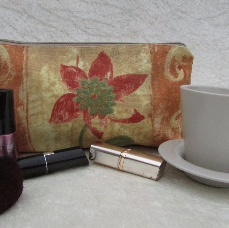A useful cosmetic bag in a sandy beige and terracotta coloured fabric with a red and green flower on one side and an orange and green flower on the other. The make up bag has a beige zip and is lined with cream fabric. The base of the bag is boxed giving lots of space inside.